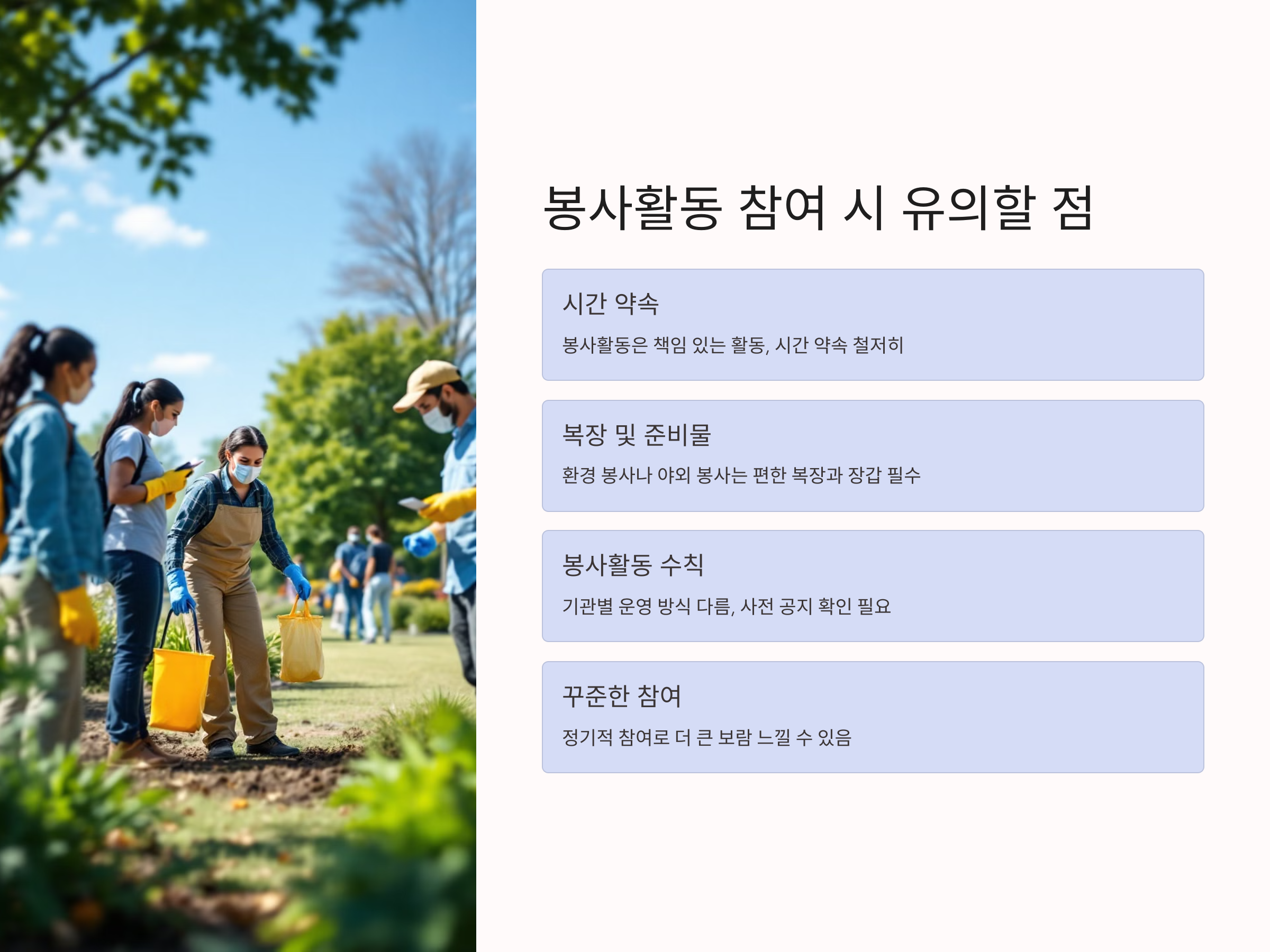 - 봉사활동 수칙 숙지: 기관별로 운영 방식이 다르므로 사전 공지를 잘 확인해야 합니다.