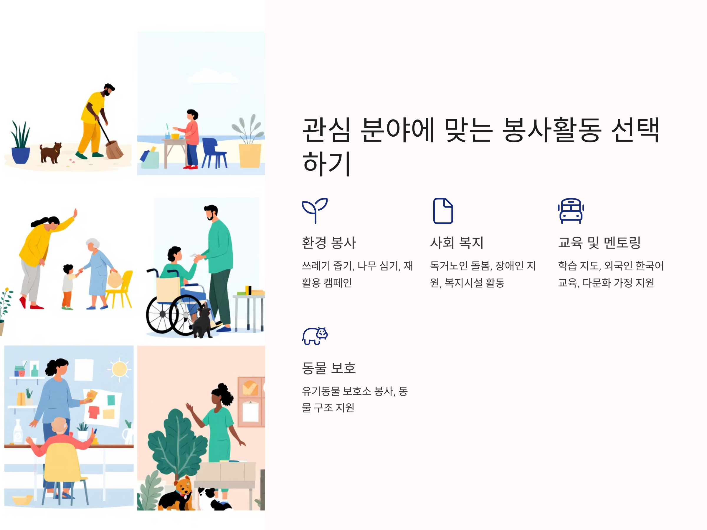 - 교육 및 멘토링: 학습 지도, 외국인 한국어 교육, 다문화 가정 지원