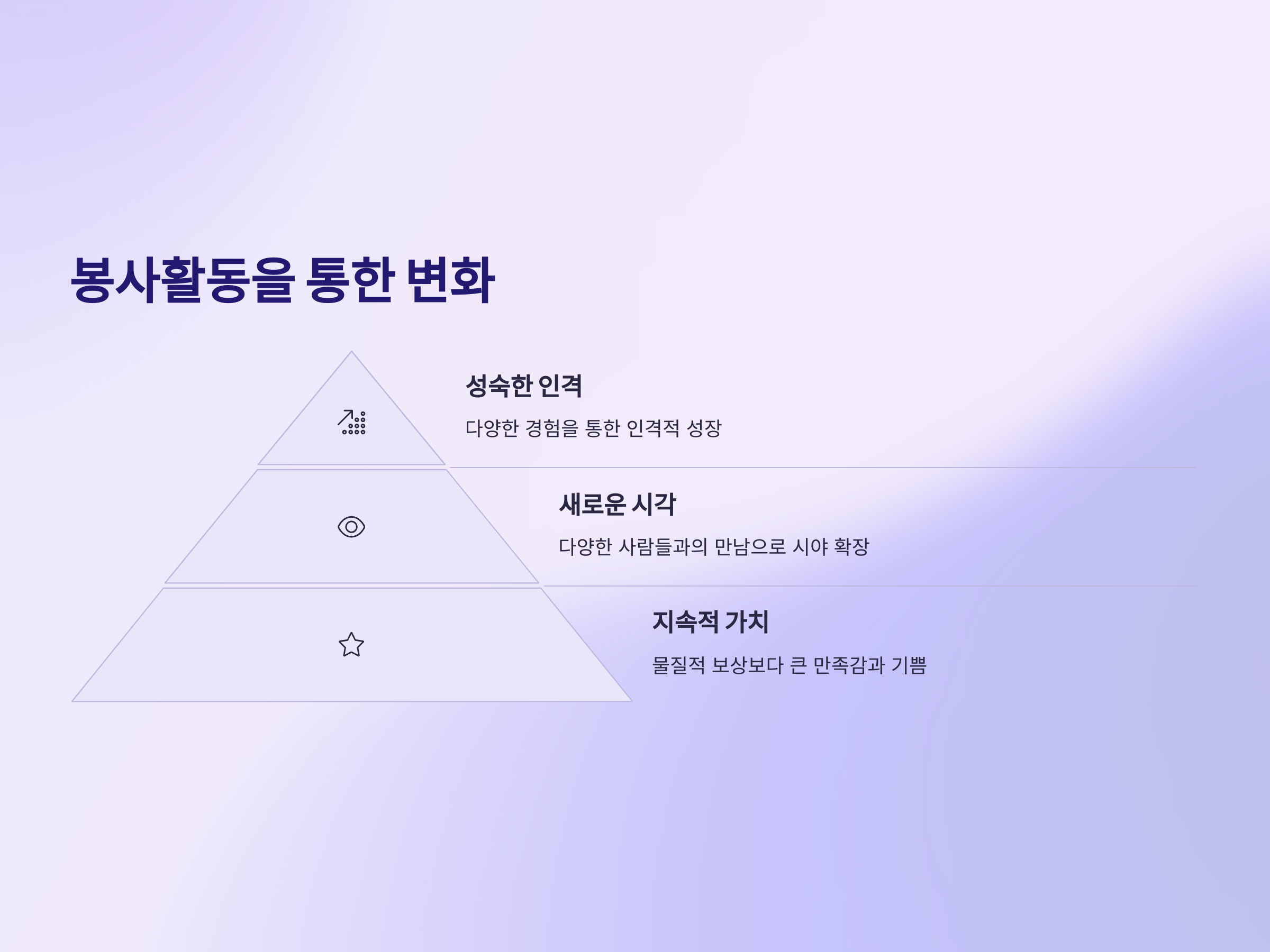 봉사활동을 통해 얻을 수 있는 보람은 금전적 가치를 넘어서게 되므로, 참여하기 전에 본인의 의도와 목표를 명확히 하는 것이 중요합니다.