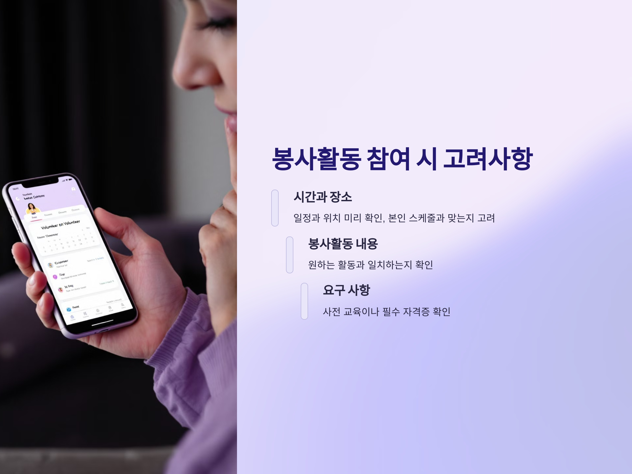 1. 시간과 장소: 봉사활동의 시간과 장소를 미리 확인하고, 본인의 일정을 맞출 수 있는지 고려합니다. 활동 장소가 멀거나 시간이 맞지 않으면 참여가 어려울 수 있습니다.