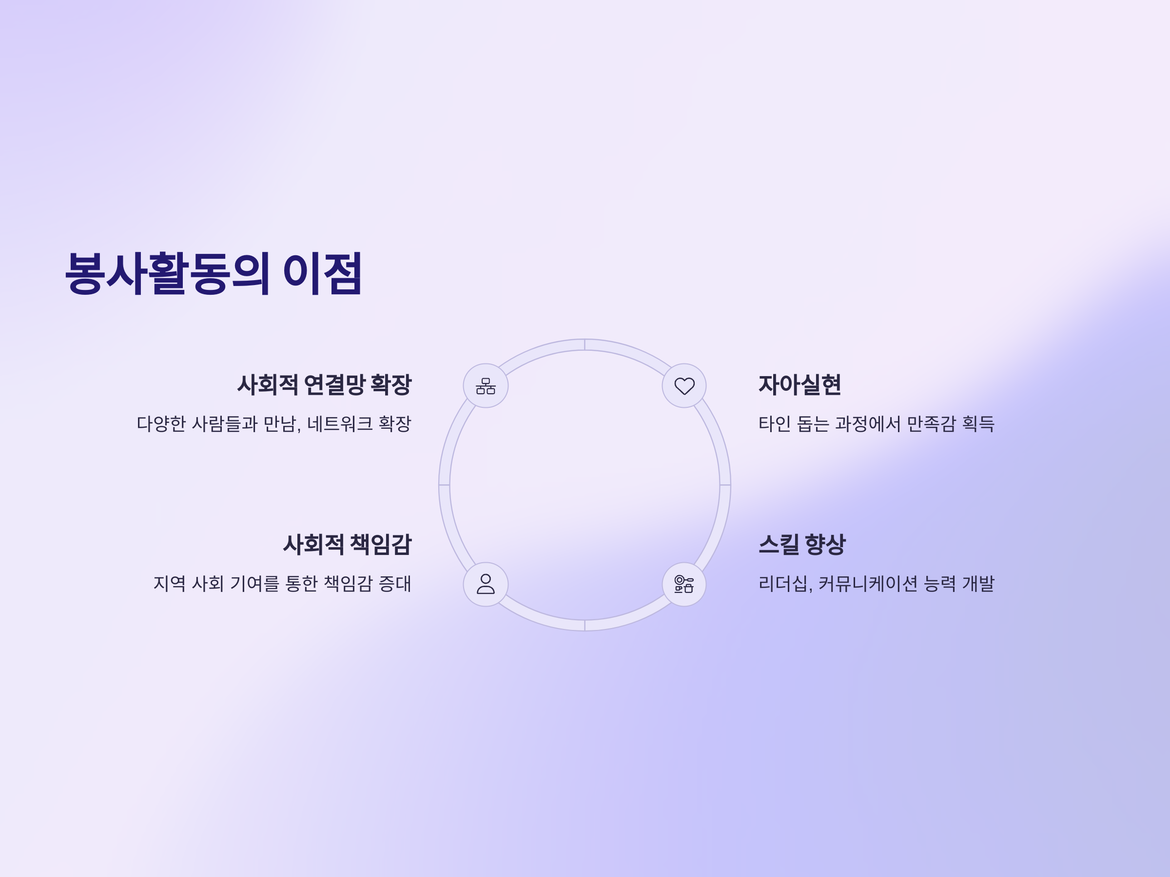 - 사회적 연결망 확장: 봉사활동을 통해 다양한 사람들과 만날 수 있어 사회적 네트워크를 확장할 수 있습니다.