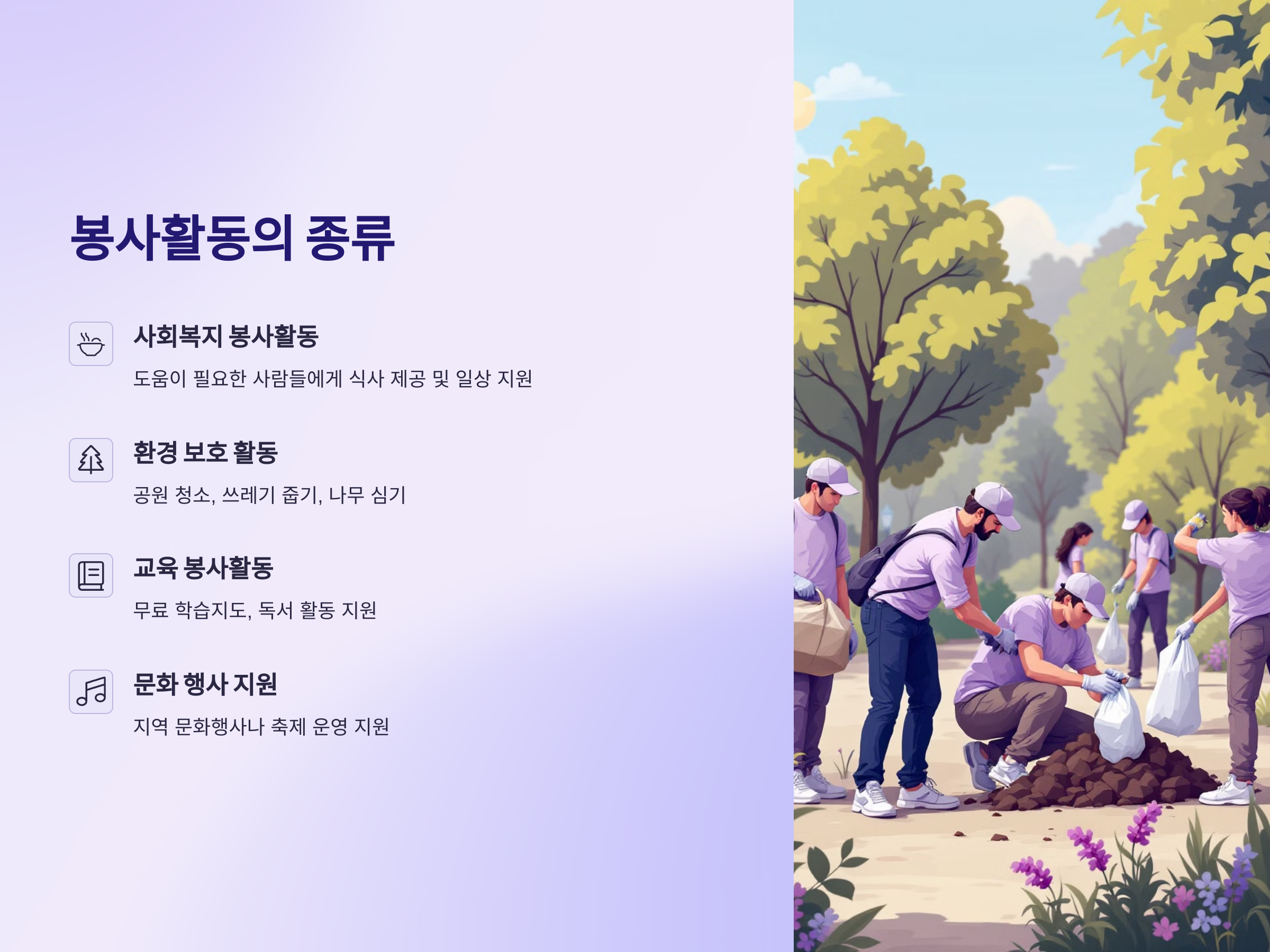 - 환경 보호 활동: 공원 청소, 쓰레기 줍기, 나무 심기 등 환경을 보호하는 활동