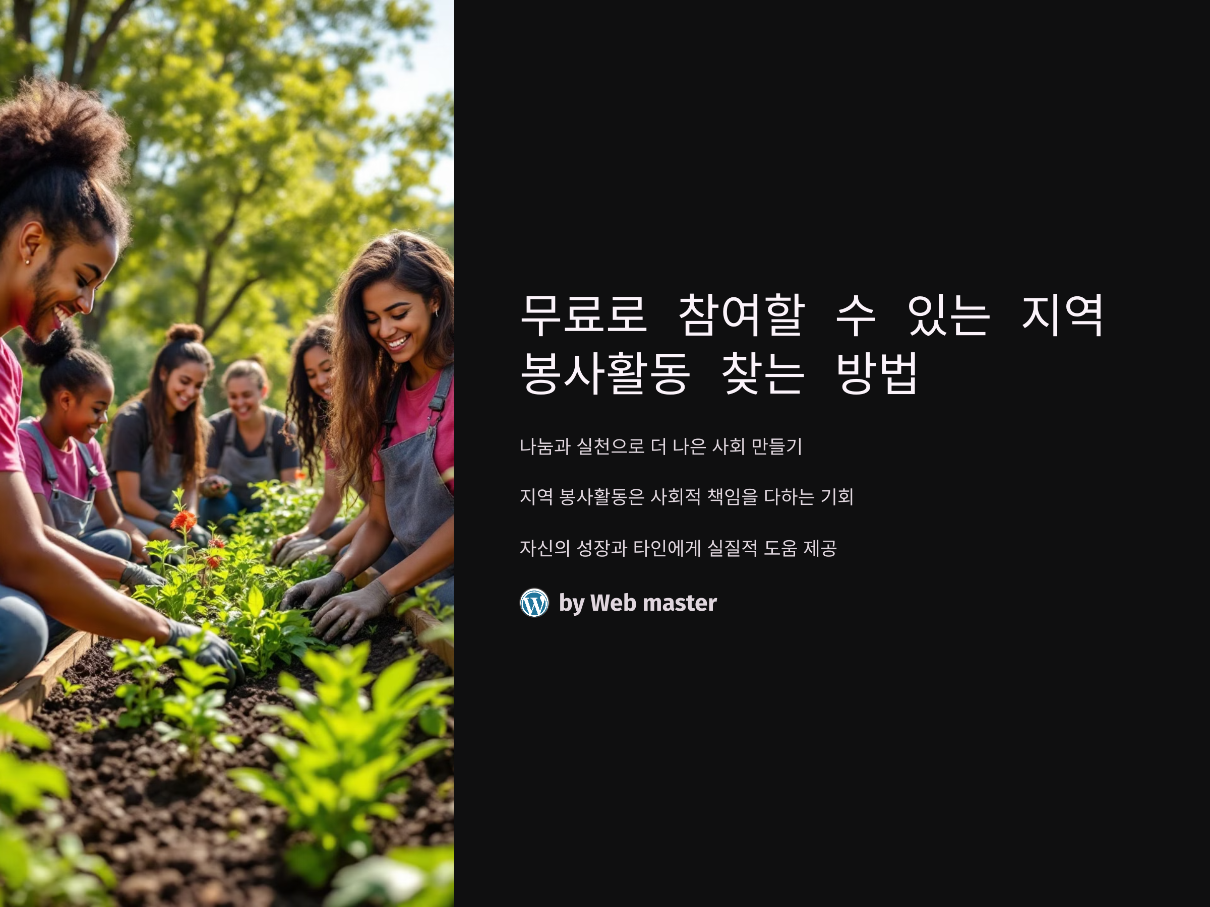 무료 봉사활동에 참여하는 것은 나만을 위한 일이 아닙니다. 내 지역 사회를 돕고, 더 나은 사회를 만드는 데 중요한 역할을 합니다. 다양한 봉사활동 기회를 찾아 참여하고, 그 활동을 통해 얻을 수 있는 가치와 보람을 충분히 경험해 보세요. 나눔과 실천은 결국 더 큰 변화를 만들어 나갑니다. 오늘도 나의 작은 손길이 큰 도움이 될 수 있다는 믿음을 가지고, 지역 봉사활동에 참여해 보세요.