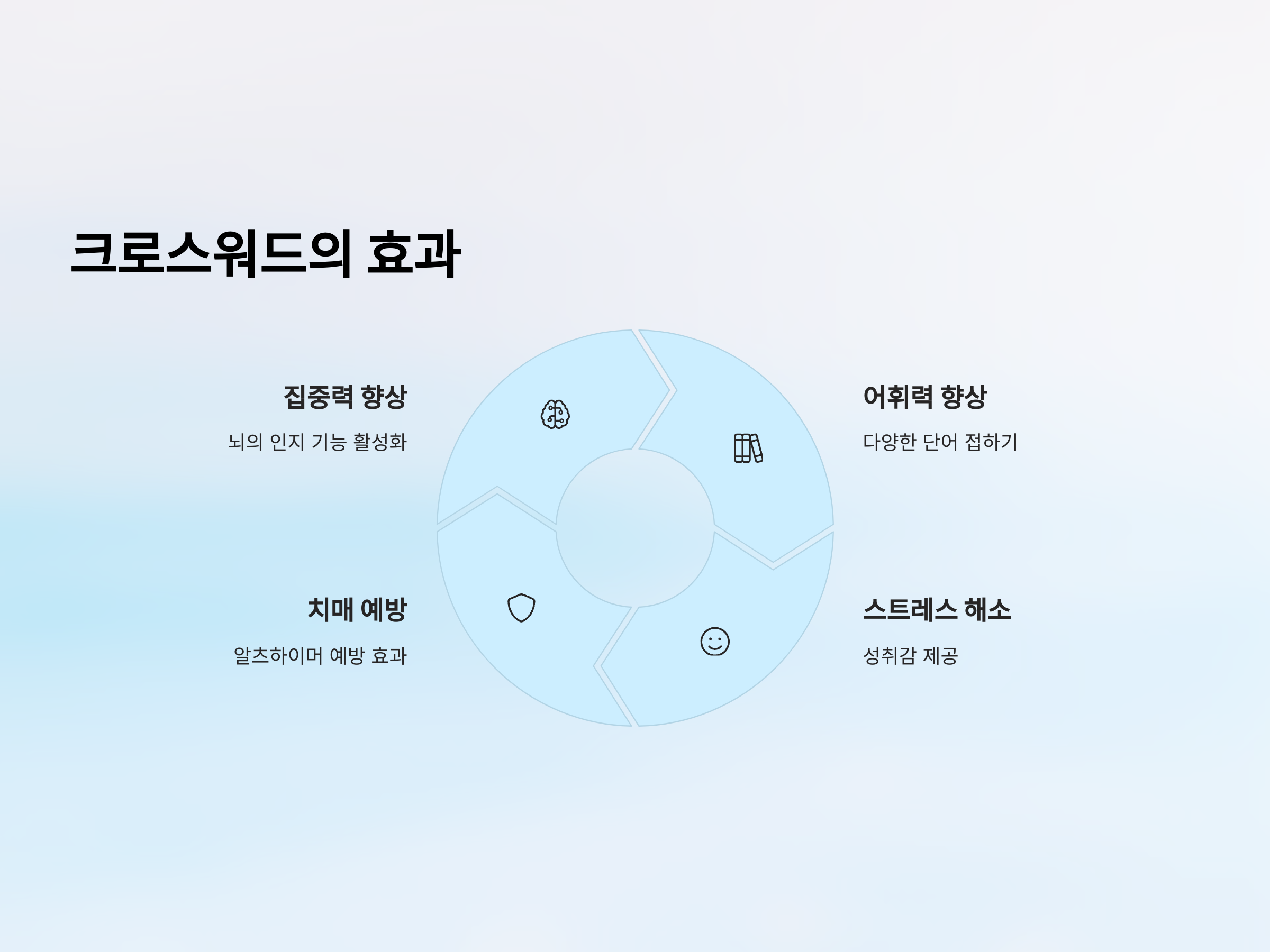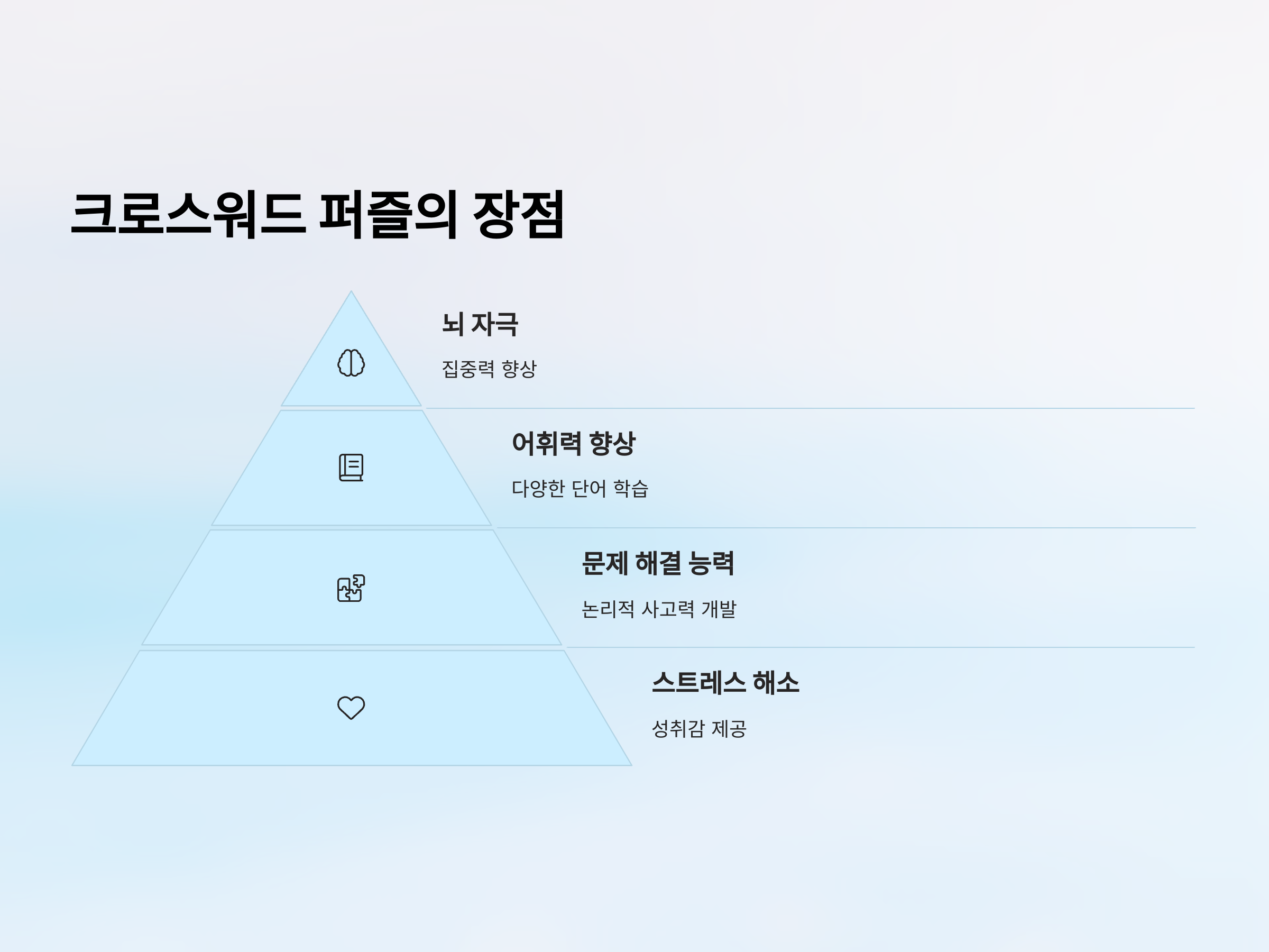 크로스워드를 풀면서 다양한 단어와 지식을 배우게 됩니다. 영어 단어의 뜻뿐만 아니라 역사, 과학, 문화 등 여러 분야에 관한 정보를 접할 수 있어 지식이 확장됩니