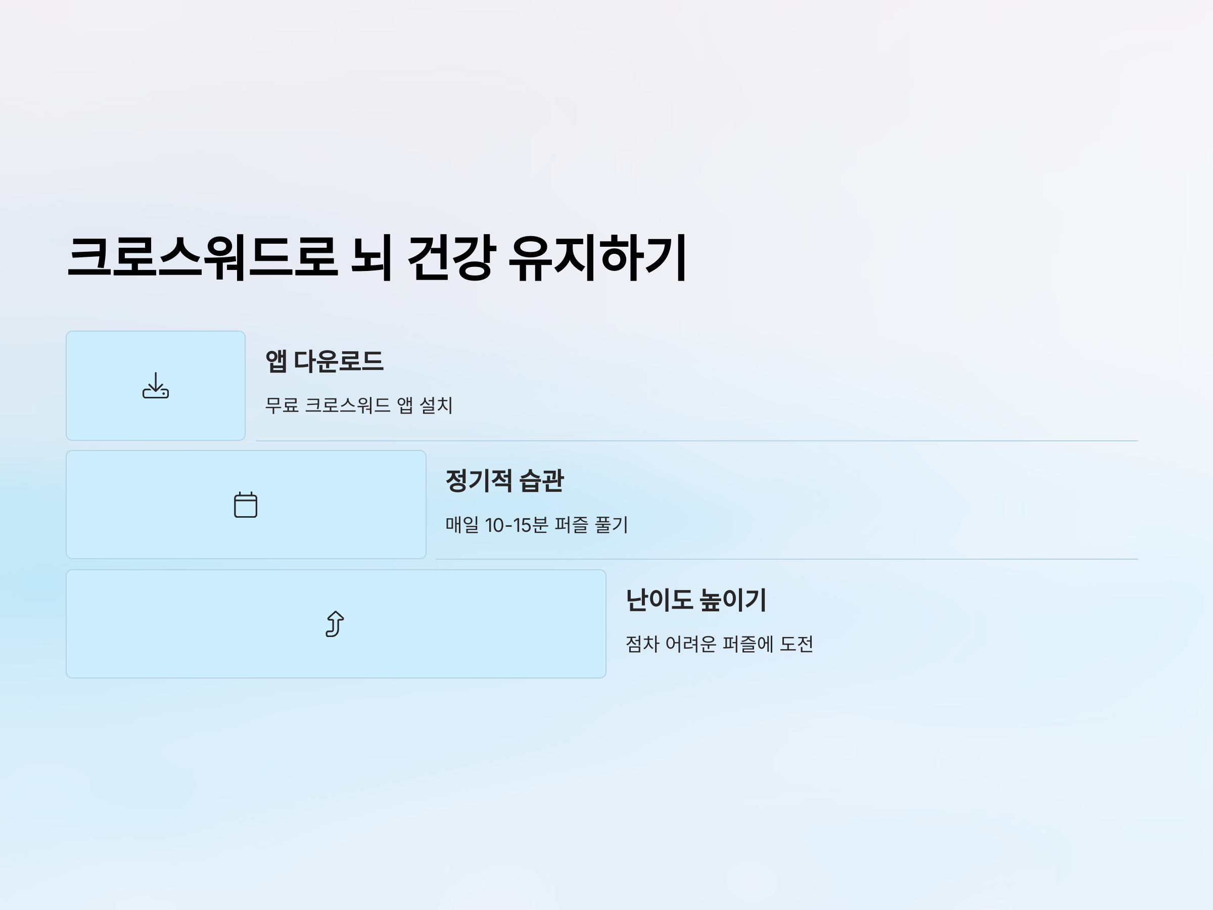크로스워드를 풀면 뇌의 여러 부위를 자극하여 집중력과 기억력을 향상시킬 수 있습니다. 특히, 정해진 시간 안에 퍼즐을 푼다거나, 새로운 단어를 유추하는 과정에서 뇌의 인지 기능이 활성화됩니다. 크로스워드는 일상에서 할 수 있는 간단하면서도 효과적인 뇌 운동이라고 할 수 있습니다.