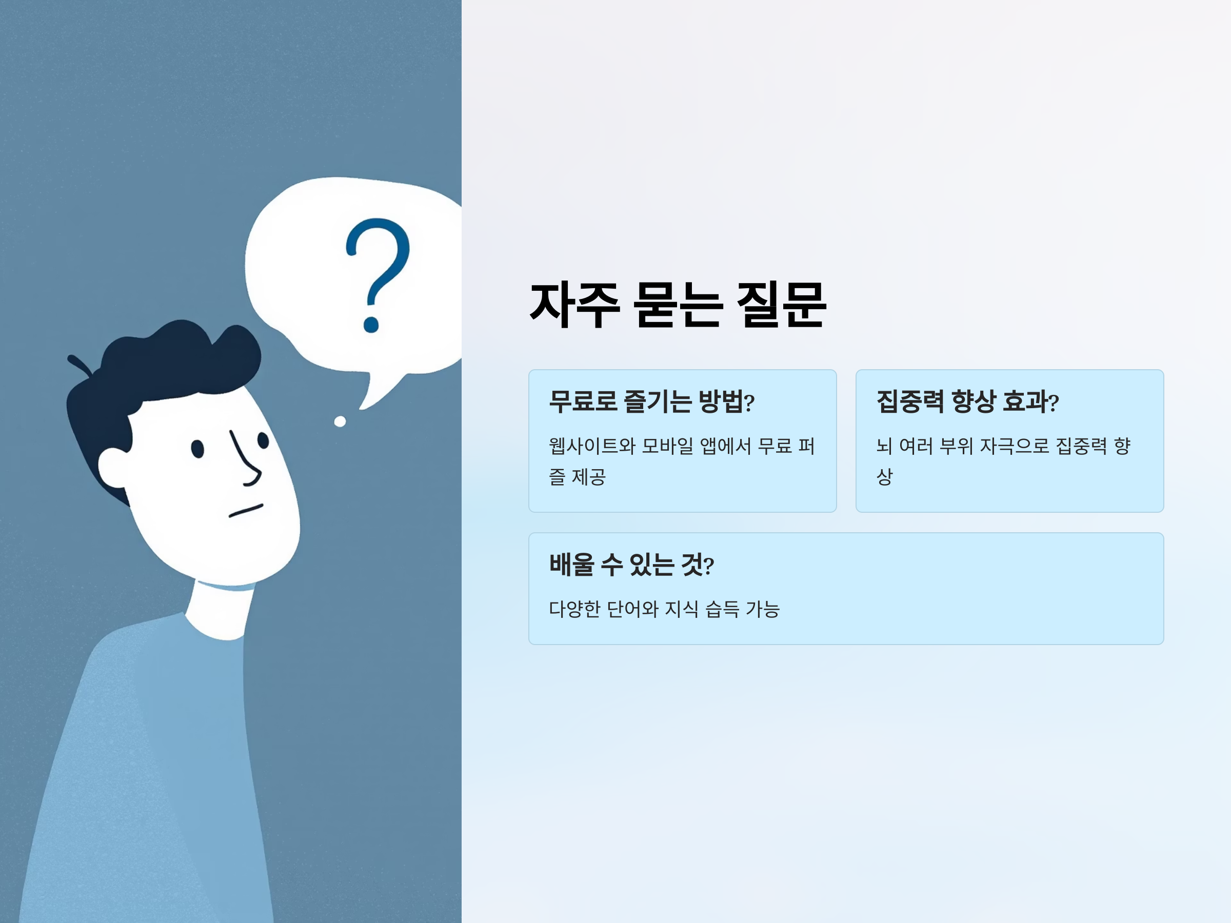 크로스워드 퍼즐을 풀면 뇌를 자극하고 집중력을 높이는 데 큰 도움이 됩니다. 또한 어휘력 향상과 문제 해결 능력 강화에도 효과적입니다. 실제로 크로스워드 퍼즐은 알츠하이머 예방에도 도움을 줄 수 있다는 연구 결과도 있습니다. 더욱이, 퍼즐을 풀 때마다 성취감을 느끼게 되어 스트레스 해소에도 좋은 영향을 미칩니다. 다양한 무료 플랫폼을 통해 이런 혜택을 쉽게 누릴 수 있다는 점은 크로스워드 퍼즐을 즐기는 큰 장점입니다.