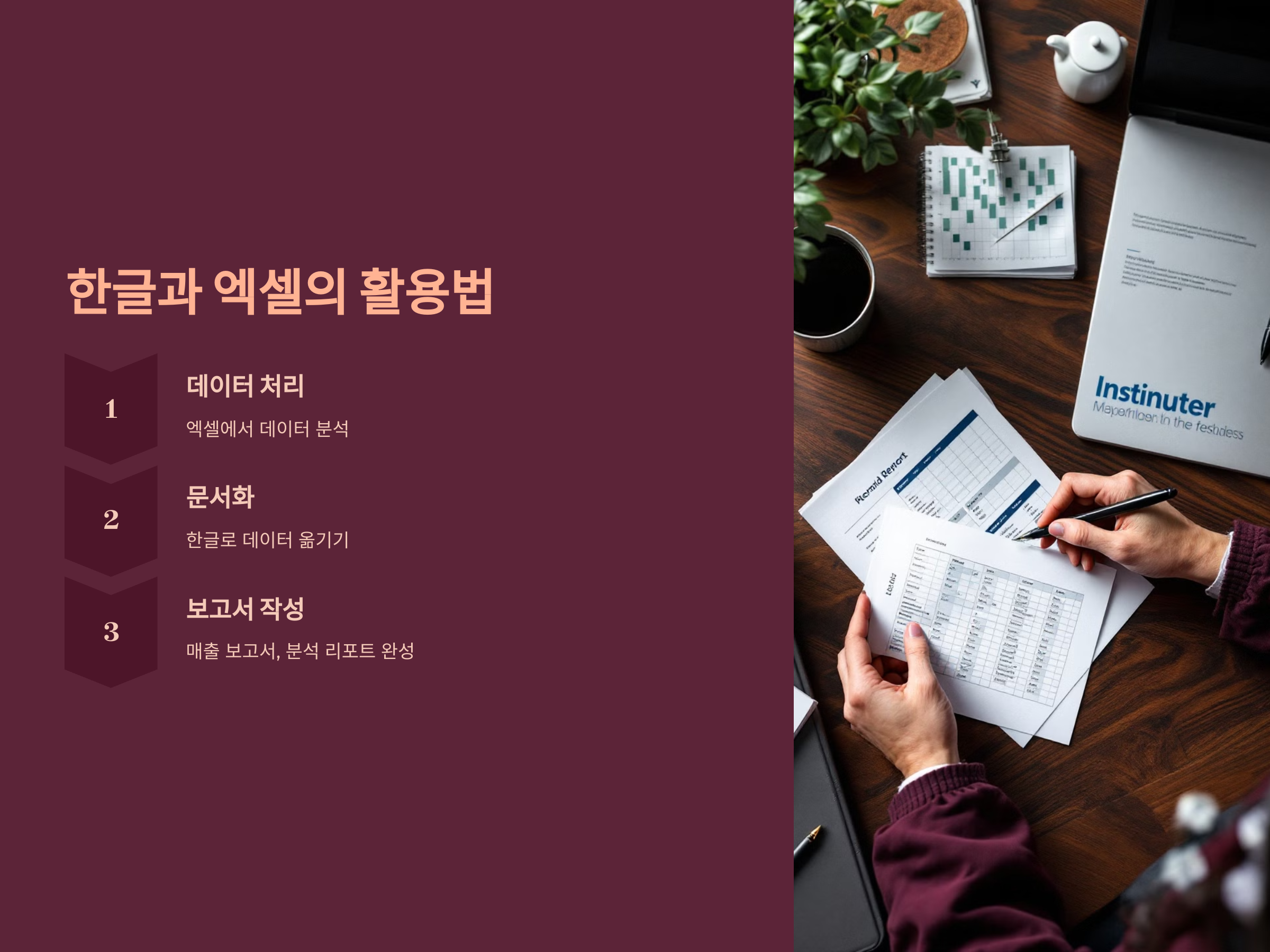 엑셀에서 데이터를 처리하고, 그 데이터를 한글로 옮겨 문서화하는 작업은 대부분의 직장에서 흔히 일어나는 일입니다. 예를 들어, 매출 보고서나 분석 리포트를 작성할 때, 엑셀의 차트나 표를 한글로 옮겨 문서화하는 과정이 필요합니다. 이때, 한글과 엑셀을 동시에 잘 활용할 수 있으면 업무 효율성이 급격히 상승합니다.