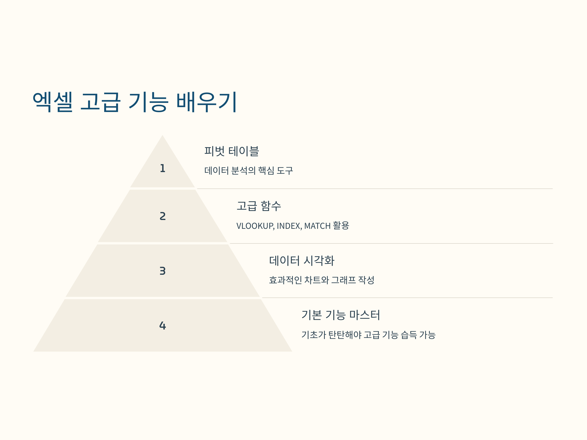 엑셀을 잘 다루는 사람은 기본적인 기능만 아는 사람이 아닙니다. 엑셀의 고급 기능을 익히는 것도 중요합니다. 예를 들어, 데이터 분석을 위한 피벗 테이블, 복잡한 함수(예: VLOOKUP, INDEX, MATCH) 등을 사용하면 업무 효율이 높아집니다. 이런 고급 기능은 유튜브와 온라인 강좌에서 무료로 배울 수 있으며, 한 번 익히면 업무에 큰 도움이 됩니다.