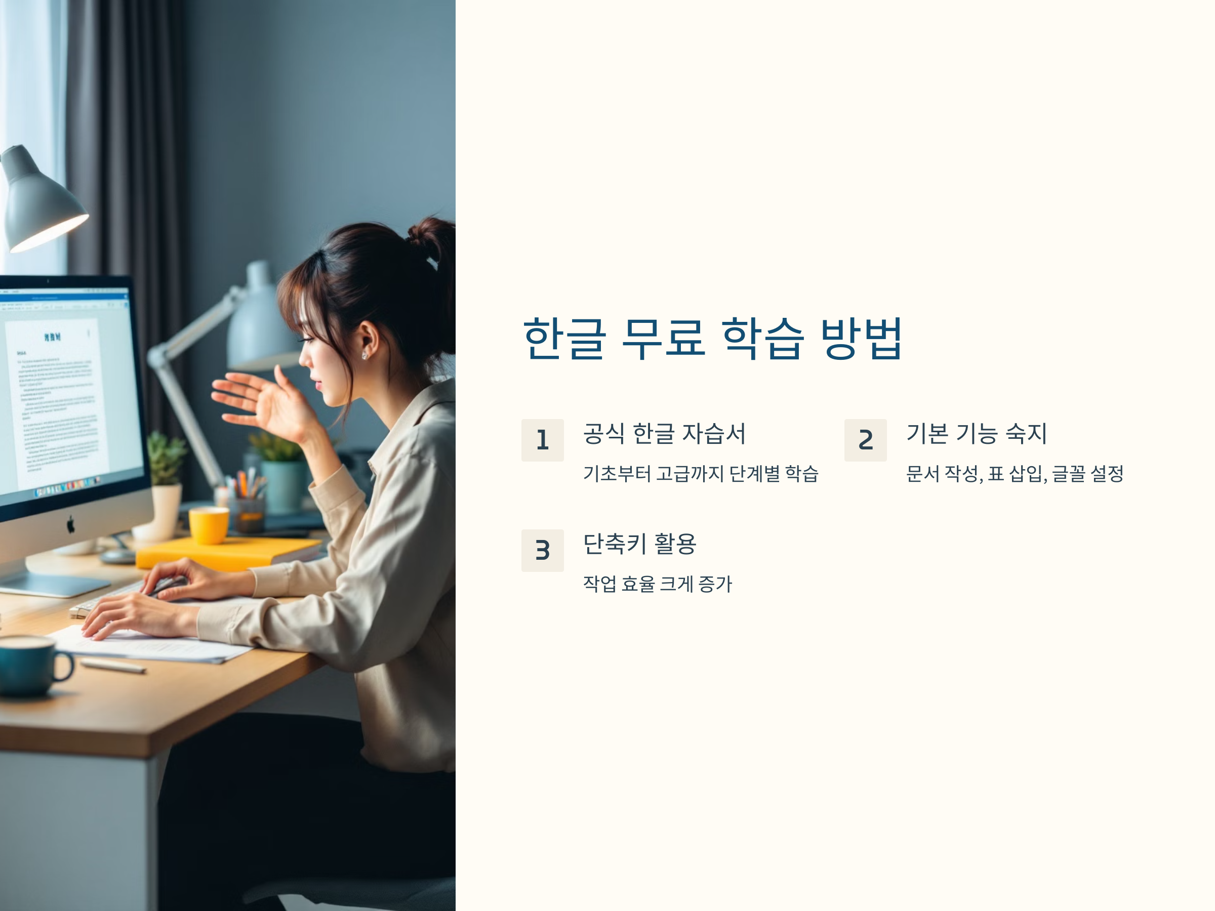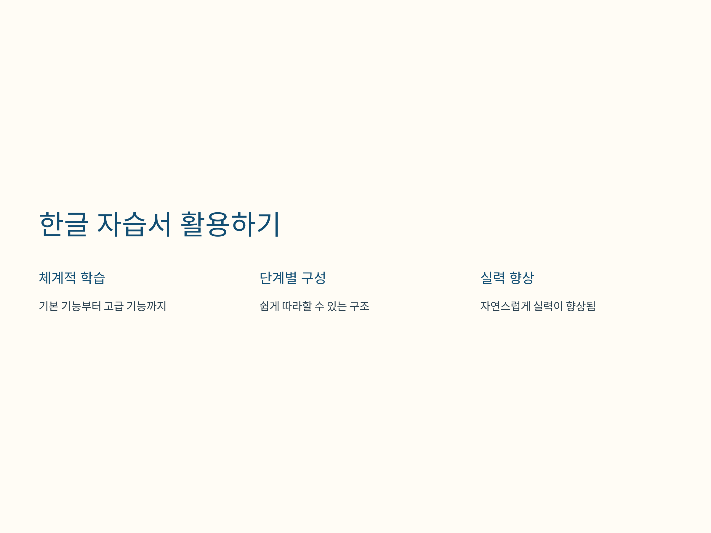 한글 자습서를 통해 기본적인 문서 작성법, 표 삽입, 글꼴 설정, 페이지 설정 등 다양한 기능을 익힐 수 있습니다. 자습서를 따라하면서 차근차근 기능을 익히다 보면, 자연스럽게 실력이 향상됩니다. 또한, 한글을 다룰 때 중요한 단축키와 꿀팁을 알게 되어 작업 효율도 크게 증가합니다.