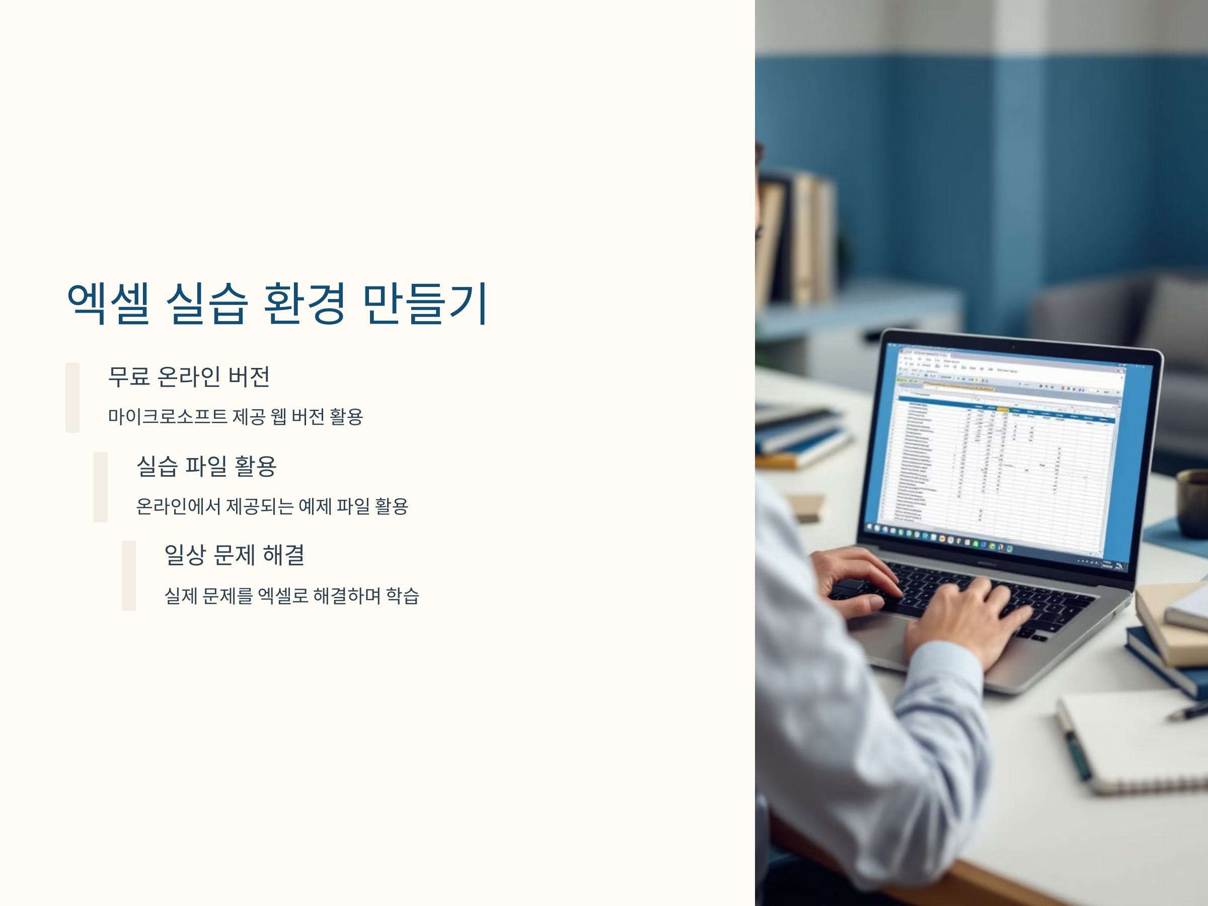 엑셀을 잘 배우기 위해서는 실습이 중요합니다. 무료로 엑셀을 실습할 수 있는 환경을 만드는 것이 엑셀을 빠르게 익히는 비법입니다. 마이크로소프트에서 제공하는 엑셀 온라인 버전은 완전 무료로 제공되며, 인터넷만 있으면 어디서든 실습할 수 있습니다. 이 버전은 기본적인 엑셀 기능을 모두 사용할 수 있기 때문에 엑셀 실력을 쌓는 데 매우 유용합니다.