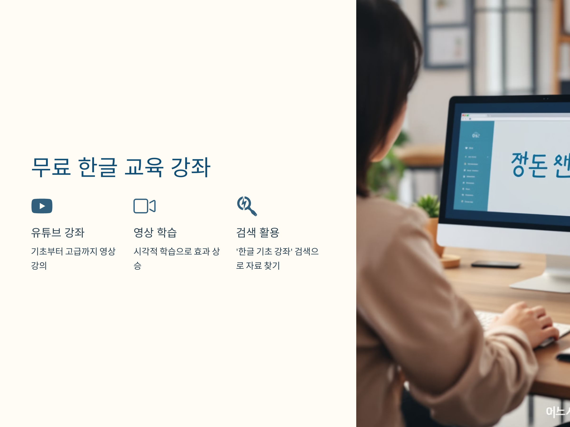 인터넷에는 다양한 무료 한글 교육 강좌들이 있습니다. 유튜브에서 한글 기초부터 고급 강좌까지 쉽게 찾을 수 있습니다. '한글 기초 강좌' 또는 '한글 실무 강좌' 등을 검색하면, 관련 강좌를 제공하는 채널들이 많이 나옵니다. 이 강좌들은 대개 무료로 제공되며, 영상으로 쉽게 따라할 수 있어 학습 효과가 뛰어납니다.