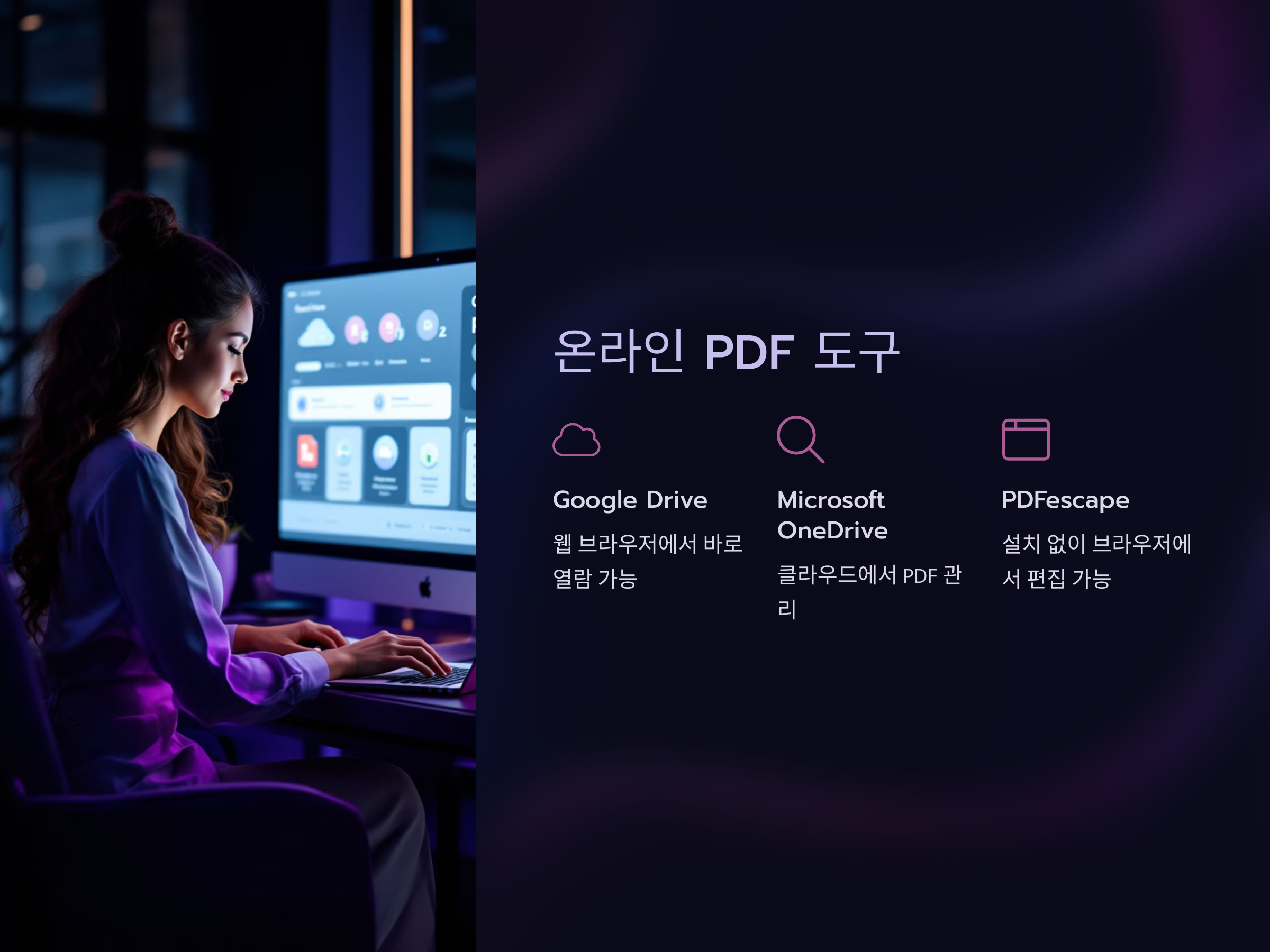 PDF 파일을 보려면 반드시 프로그램을 설치할 필요는 없습니다. Google Drive나 Microsoft OneDrive와 같은 클라우드 서비스에 업로드된 PDF 파일은 웹 브라우저를 통해 바로 열 수 있습니다. Google Drive에서는 PDF 파일을 업로드한 후, 웹에서 바로 열어볼 수 있으며, Google Docs의 편집 도구를 활용해 PDF 파일을 편집하거나, 주석을 달 수 있습니다. 이 방법은 소프트웨어 설치 없이도 PDF 파일을 열고 활용할 수 있는 좋은 대안입니다.