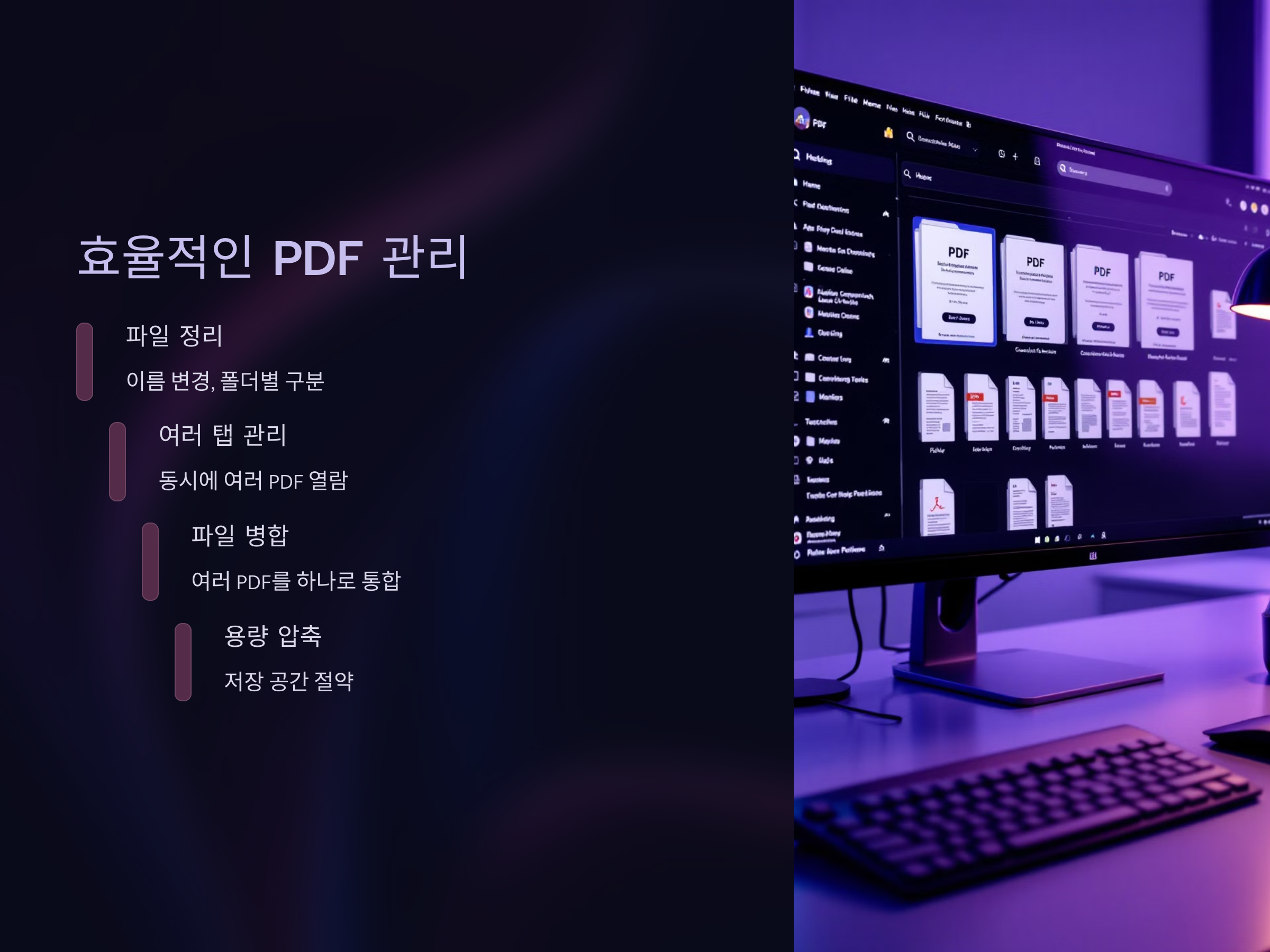 PDF 파일은 용량이 크거나 수가 많을 경우, 정리하고 관리하는 데 어려움을 겪을 수 있습니다. 이때 Adobe Acrobat Reader와 같은 도구를 사용하여 PDF 파일을 쉽게 정리하고, 이름을 바꾸거나 폴더별로 구분하여 관리할 수 있습니다. 또한, Foxit Reader와 같은 소프트웨어는 파일을 여러 개의 탭에서 열 수 있어 여러 개의 PDF 파일을 동시에 관리하는 데 유용합니다.