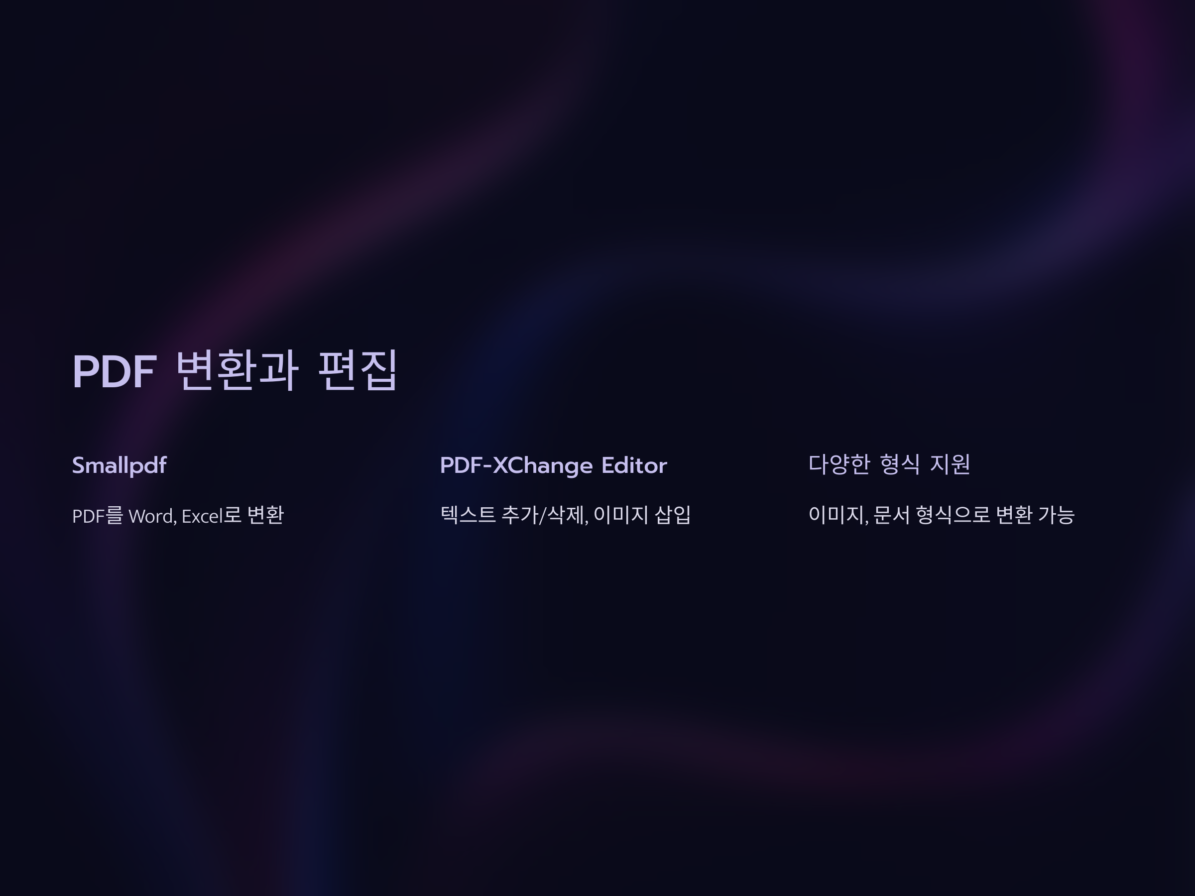 PDF 파일을 단순히 읽는 것 외에도 변환, 편집, 보안 기능을 추가하는 등의 다양한 활용법이 있습니다. 예를 들어, Smallpdf와 같은 온라인 도구를 사용하면 PDF 파일을 다른 형식으로 변환할 수 있습니다. 이 도구는 PDF를 Word, Excel, PowerPoint 파일로 변환하거나, PDF 파일을 이미지로 변환하는 등의 기능을 제공합니다. 이렇게 변환된 파일은 보다 쉽게 수정하거나 다른 용도로 사용할 수 있습니다.