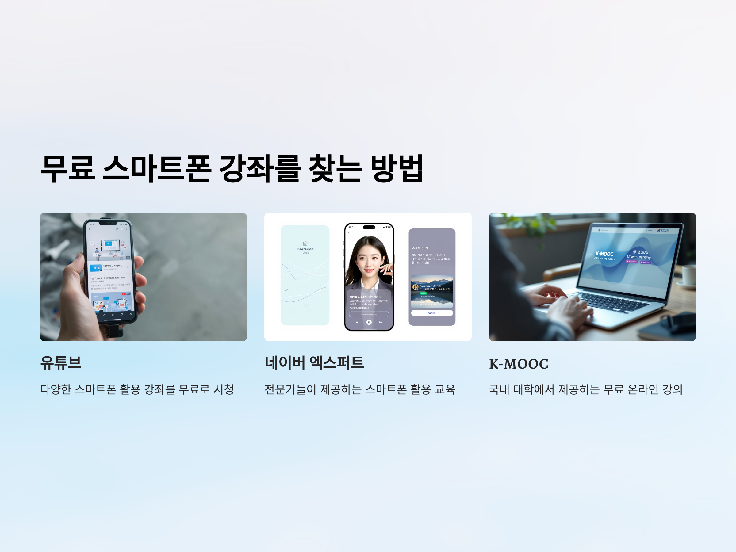 - 유튜브: 다양한 스마트폰 활용 강좌를 무료로 시청 가능