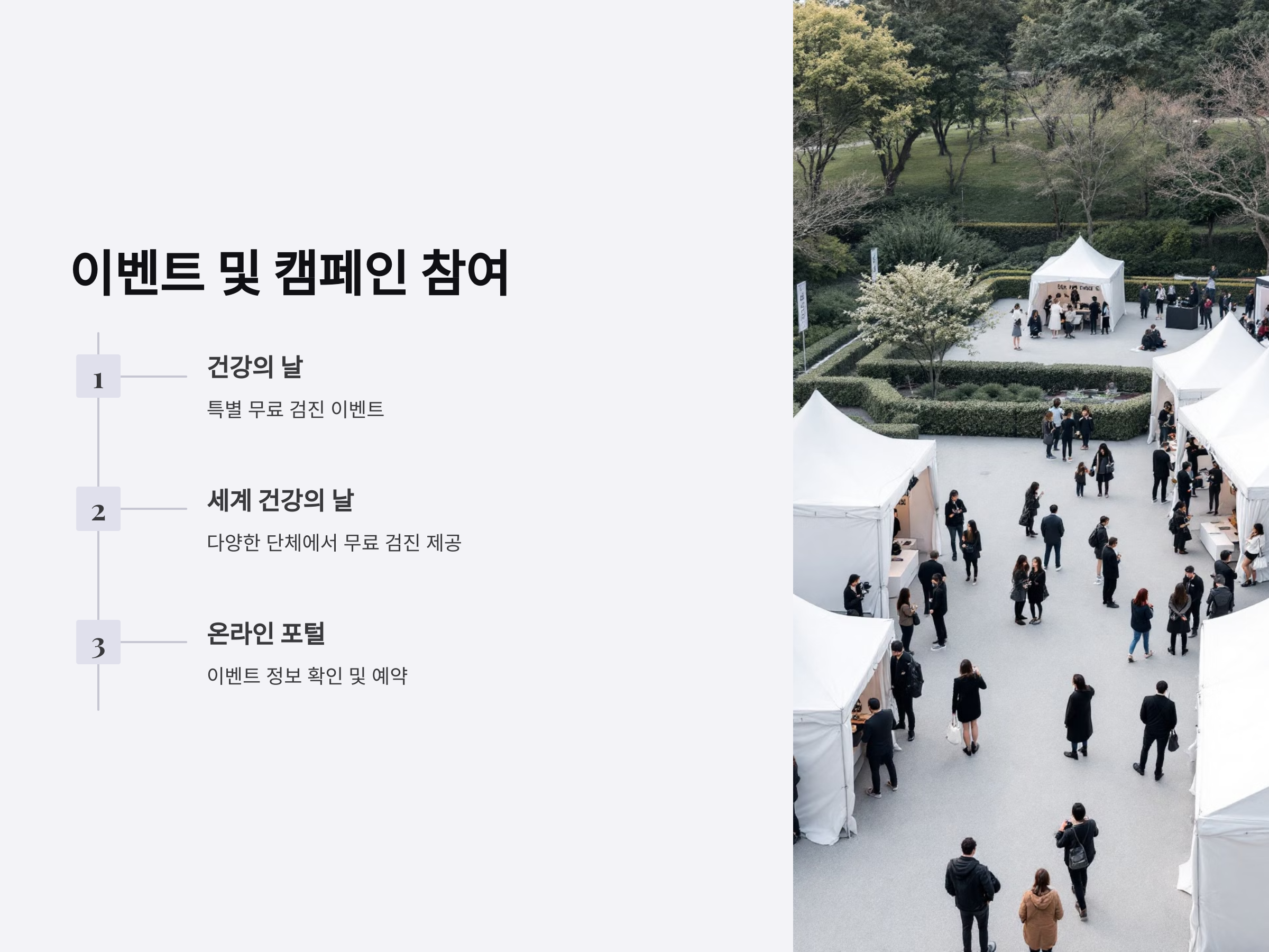 건강 관련 기업이나 비영리 단체에서는 주기적으로 무료 건강검진 이벤트나 캠페인을 진행합니다. 특히 건강의 날이나 세계 건강의 날 같은 특별한 날을 기념해 다양한 단체에서 무료 검진 이벤트를 열기도 합니다. 이를 통해 자주 받지 못한 건강검진을 무료로 받을 수 있는 기회가 제공되니, 이와 같은 캠페인 정보를 적극적으로 확인하고 참여하는 것이 좋습니다.