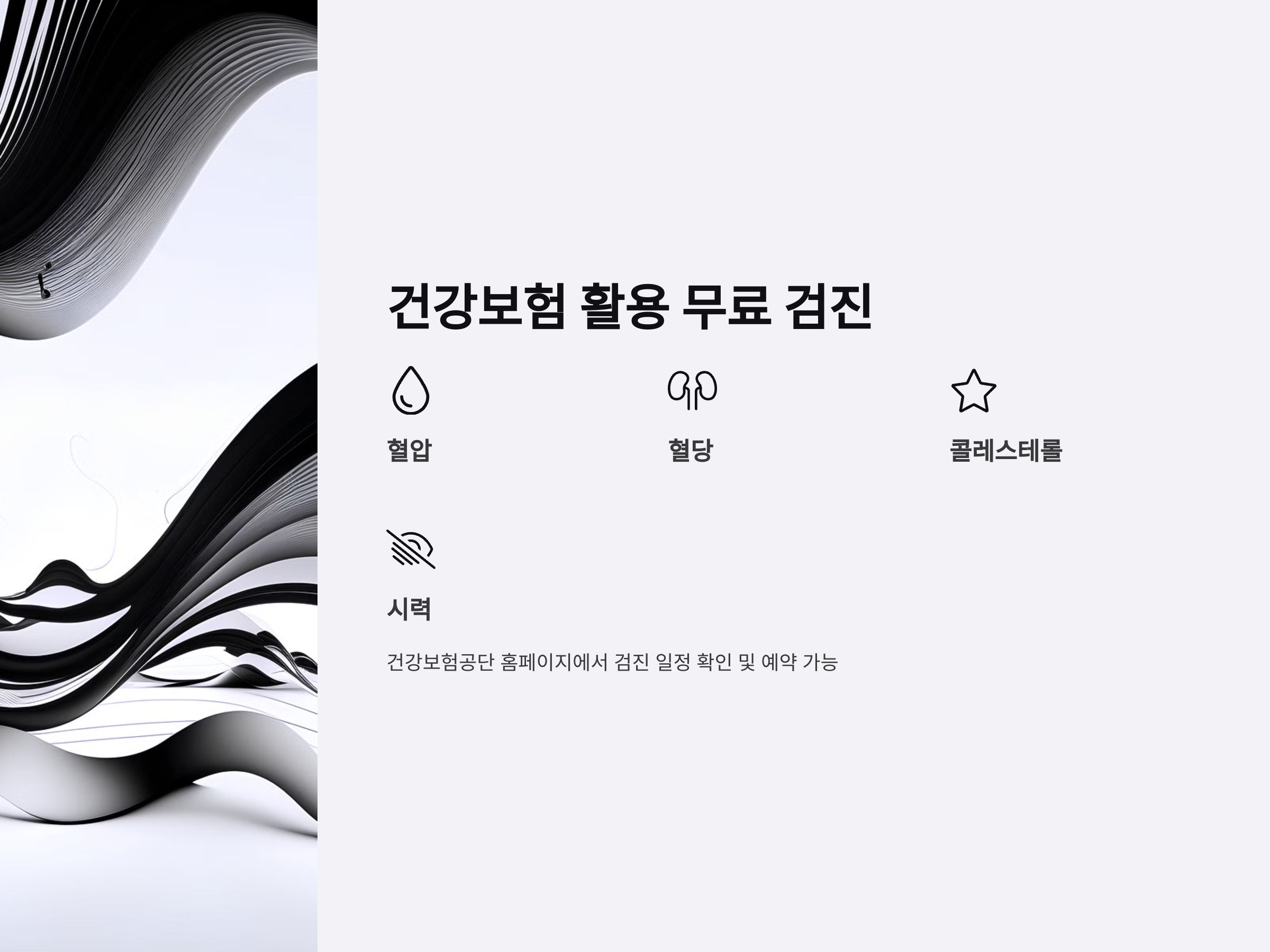 대부분의 국민건강보험 가입자는 매년 정기 건강검진을 무료로 받을 수 있습니다. 검진 항목은 혈압, 혈당, 콜레스테롤, 시력, 청력 등 기본적인 항목부터 시작해, 나이에 맞는 암검사까지 포함될 수 있습니다. 이 외에도 추가적인 검진 항목이 제공될 수 있으니, 건강검진을 예약할 때 어떤 검사가 포함되는지 체크하는 것이 중요합니다.