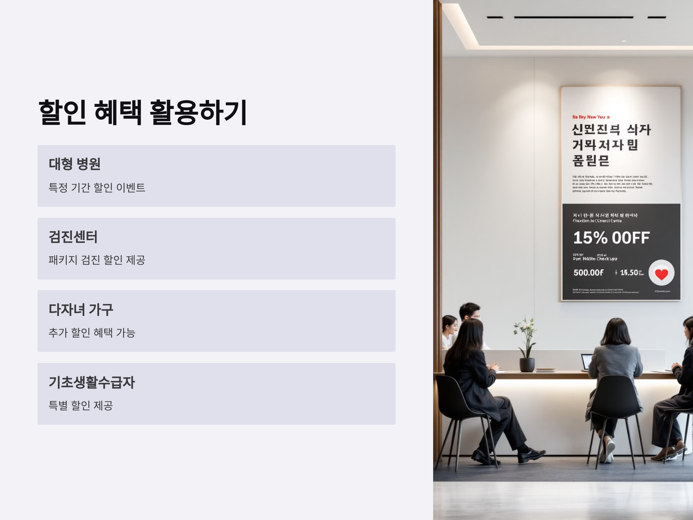 비록 모든 항목을 무료로 제공하는 것은 아니지만, 대형 병원이나 검진센터에서 제공하는 할인 혜택을 통해 건강검진을 저렴하게 받을 수 있는 방법도 있습니다. 종종 병원에서는 특정 기간에 맞춰 할인 이벤트를 진행하거나, 여러 검사를 패키지로 묶어 할인 혜택을 제공합니다. 이를 통해 적은 비용으로 건강검진을 받을 수 있습니다.