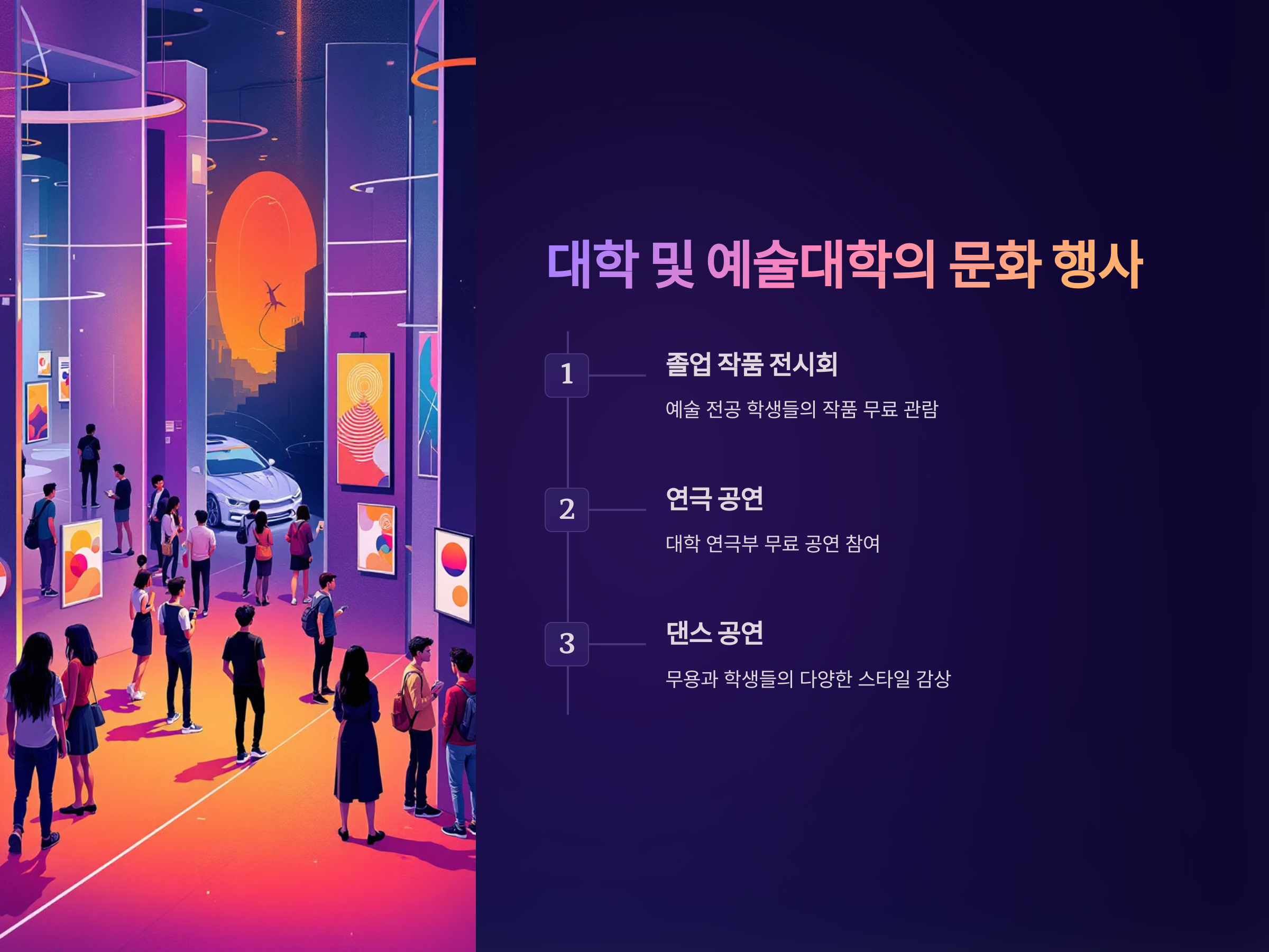 또한, 이러한 행사들은 예술을 전공하는 학생들의 작품을 볼 수 있는 좋은 기회이기도 합니다. 다양한 스타일의 작품을 무료로 감상할 수 있는 기회를 놓치지 마세요.