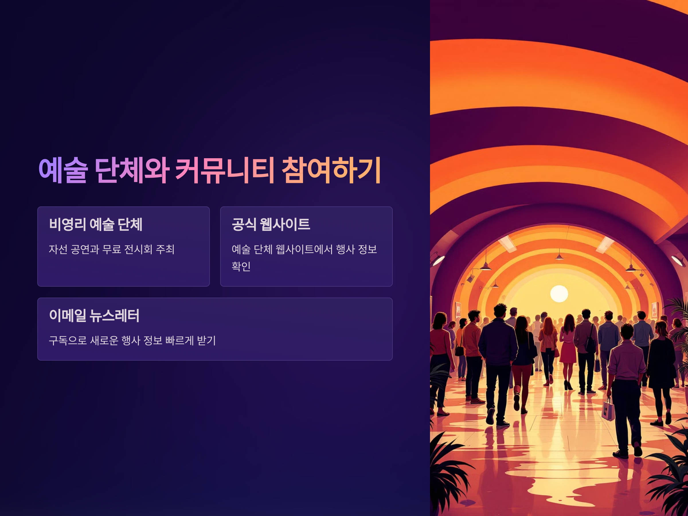 이러한 단체들은 다양한 문화 예술 활동을 통해 대중과 소통하고, 그 과정에서 무료로 제공되는 공연과 전시회를 홍보하기도 합니다. 예술 단체들의 공식 웹사이트나 이메일 뉴스레터를 구독하여, 새로운 행사에 대한 정보를 빠르게 확인하세요.