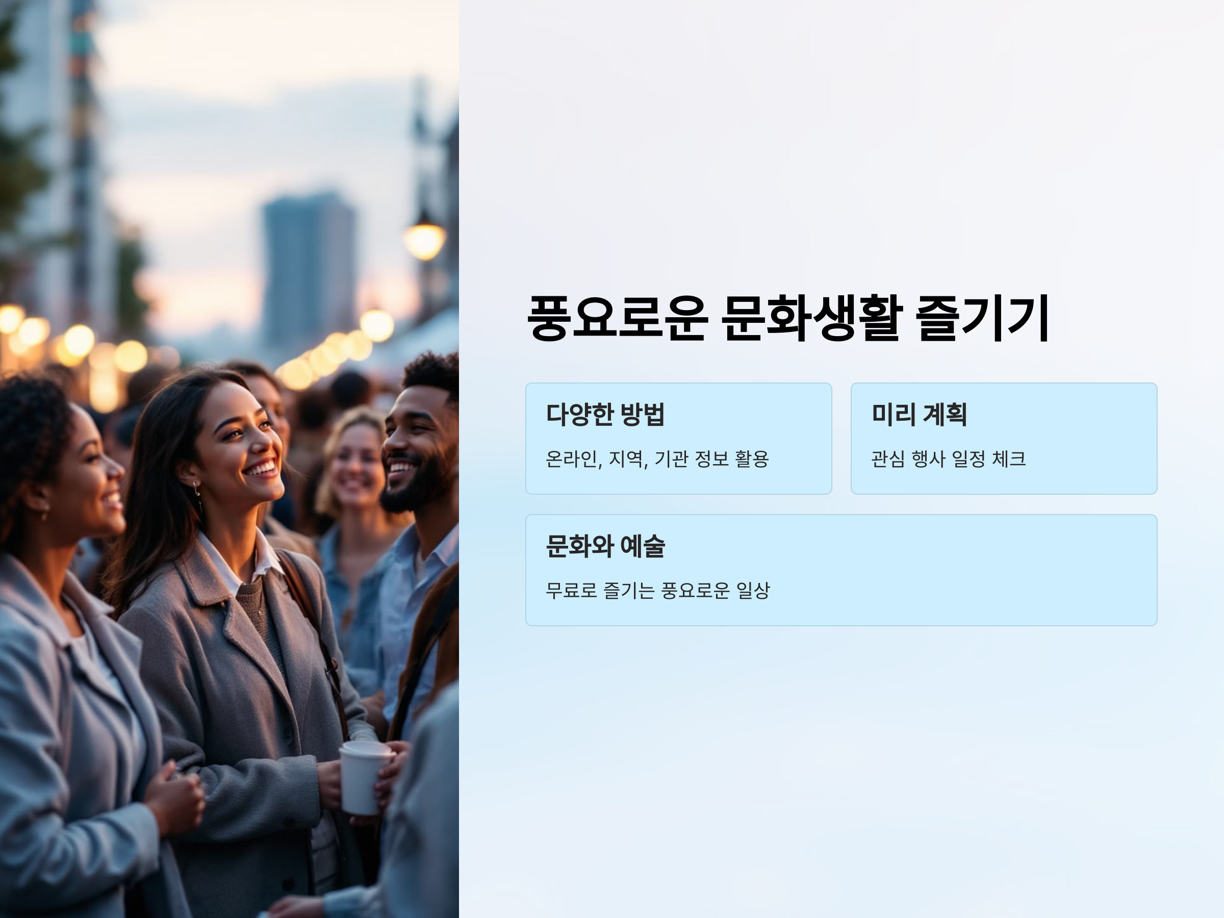 이제 여러분은 다양한 방법을 통해 무료로 제공되는 공연과 전시회를 놓치지 않고 즐길 수 있을 것입니다. 문화와 예술을 가까이에서 즐기며 더 풍요로운 일상을 만드세요!