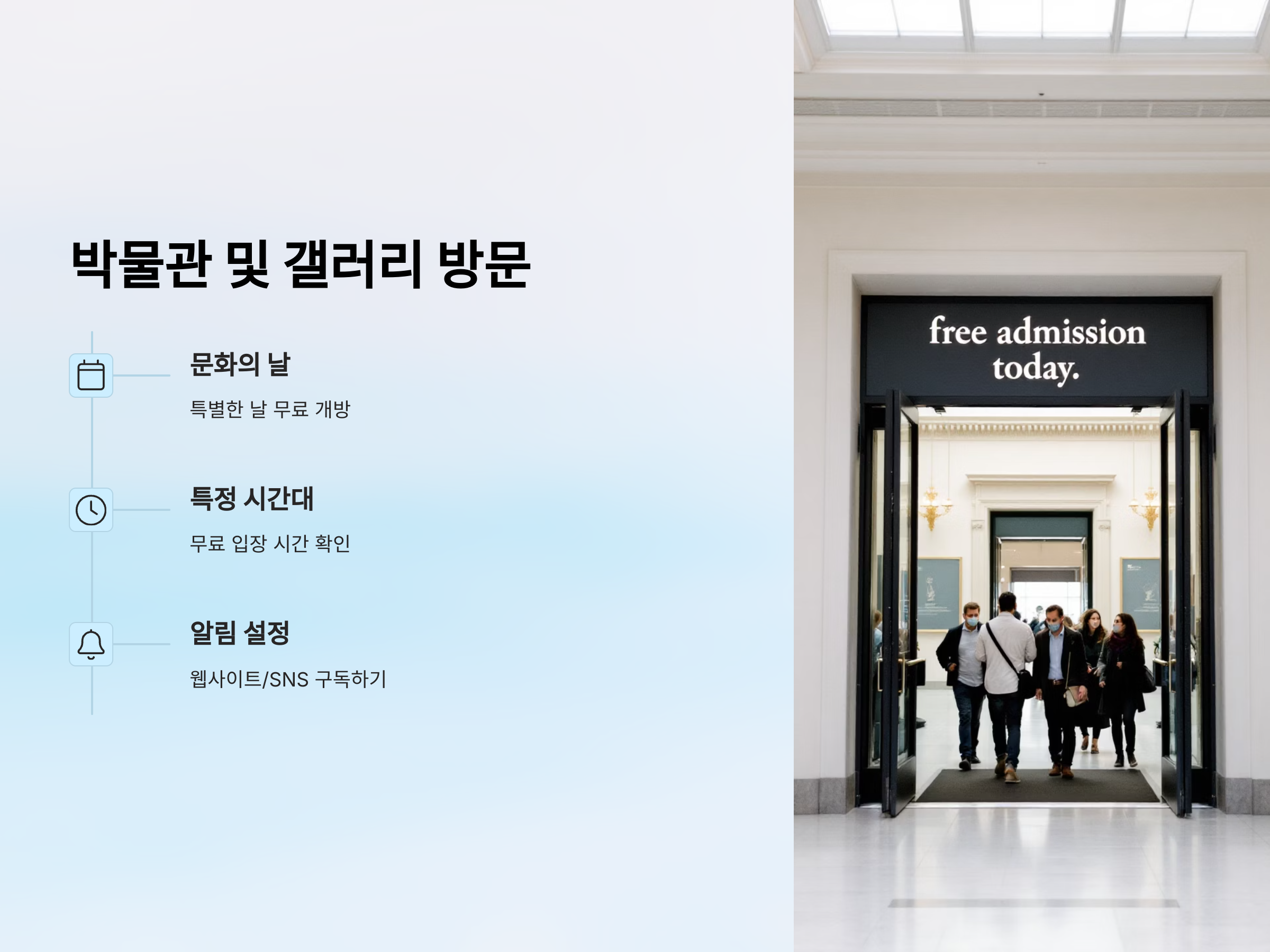 박물관과 갤러리는 보통 웹사이트나 소셜 미디어를 통해 무료 개방일을 공지하므로, 관심 있는 곳의 소식을 지속적으로 팔로우하거나 구독하는 것도 좋은 방법입니다.