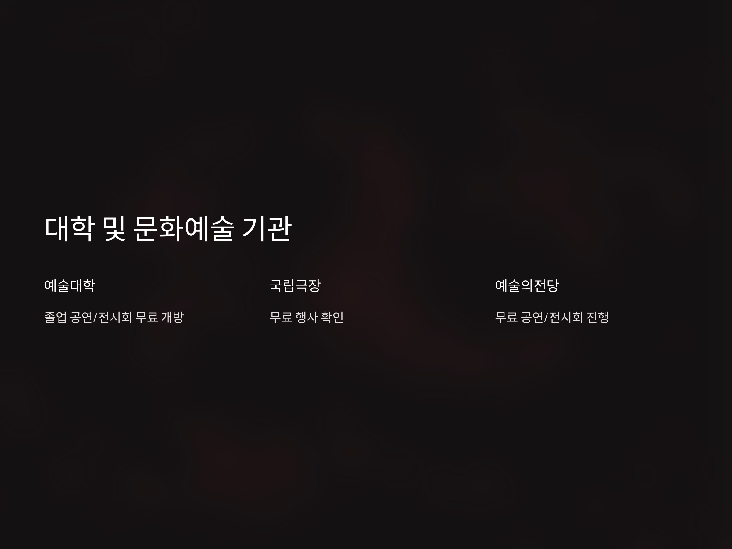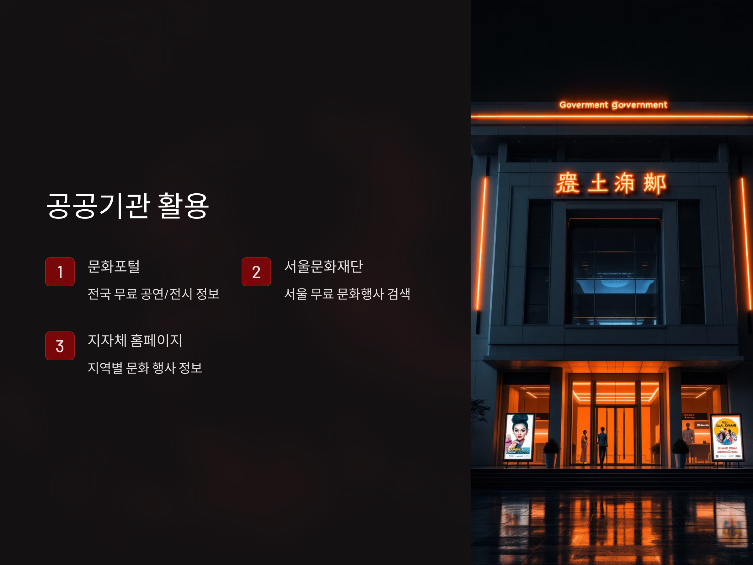 - 국립극장, 예술의전당 무료 행사 확인: 대형 문화 예술 기관에서도 무료 공연이나 전시회를 진행하는 경우가 많습니다.