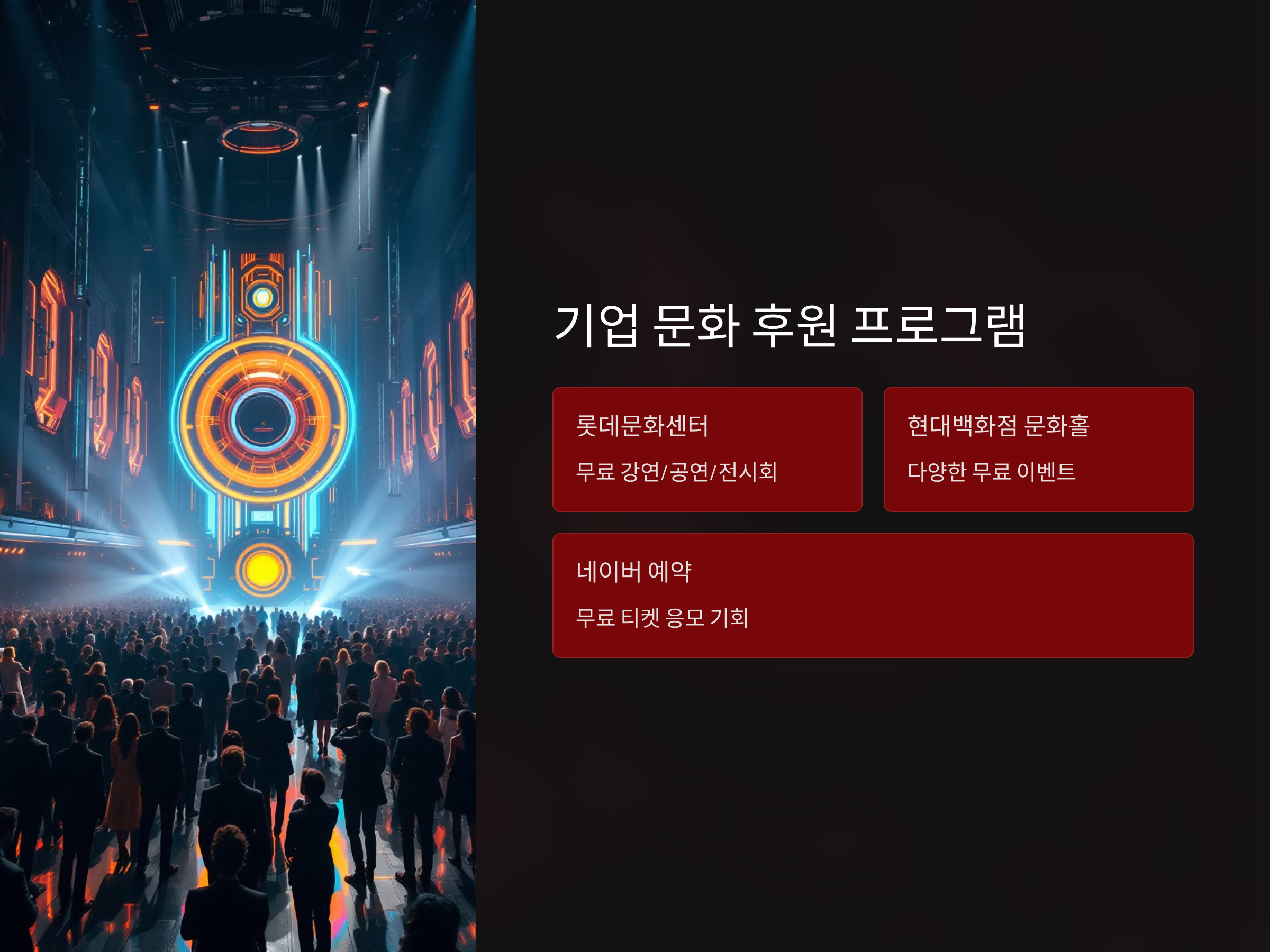 일부 대기업이나 문화예술 후원 브랜드에서는 무료 공연 및 전시회 티켓을 제공하는 경우가 있습니다. 특히 대형 서점, 백화점, 갤러리 등에서는 홍보 목적으로 무료 이벤트를 진행하기도 합니다.
