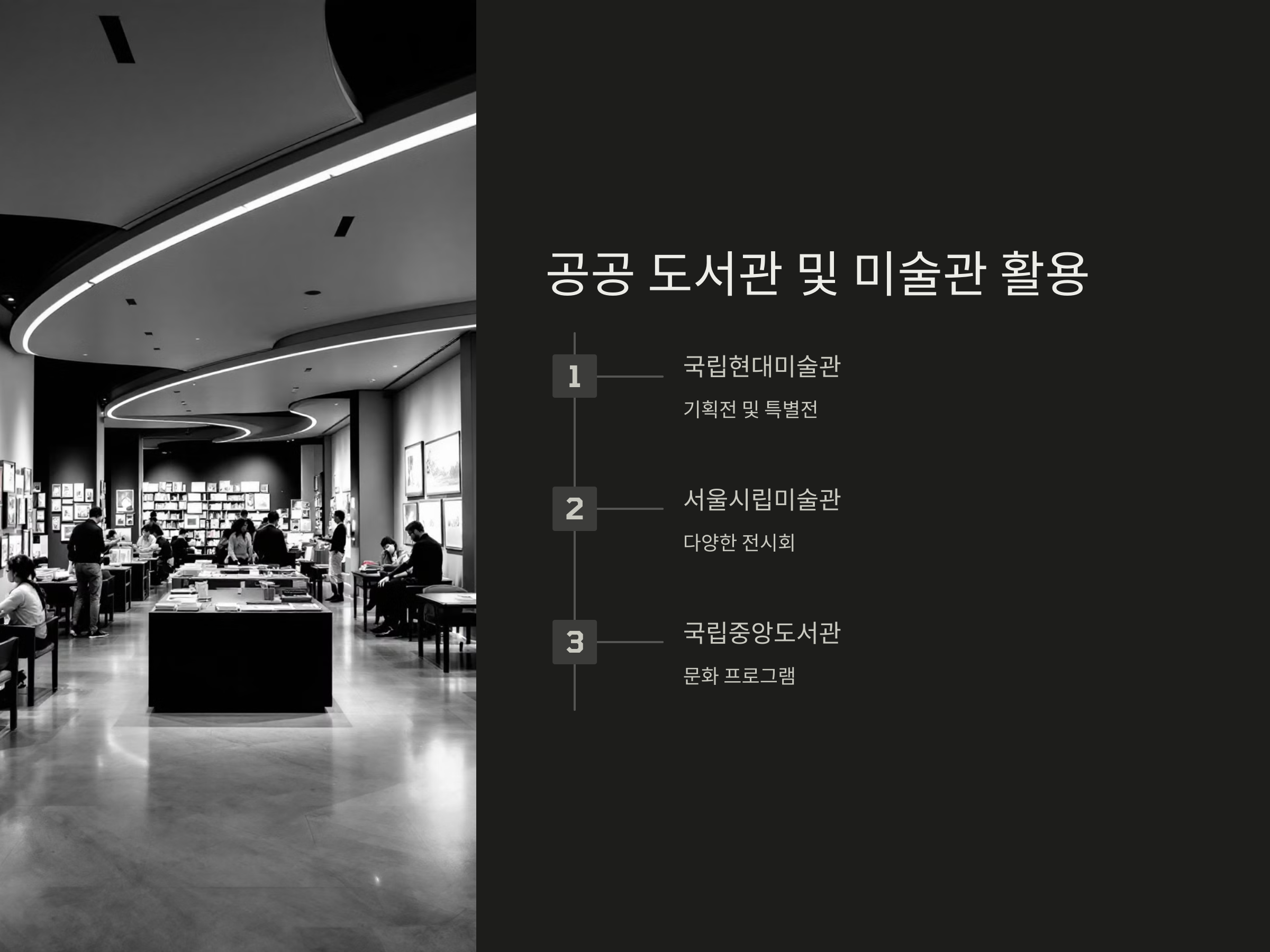 공공 도서관과 미술관에서도 정기적으로 무료 전시회를 개최합니다. 국립현대미술관, 서울시립미술관, 국립중앙도서관 등에서는 다양한 기획전과 특별전을 무료로 관람할 수 있는 기회를 제공합니다. 또한, 일부 미술관에서는 매달 마지막 주 수요일 "문화가 있는 날"을 맞아 무료 입장 이벤트를 진행합니다.