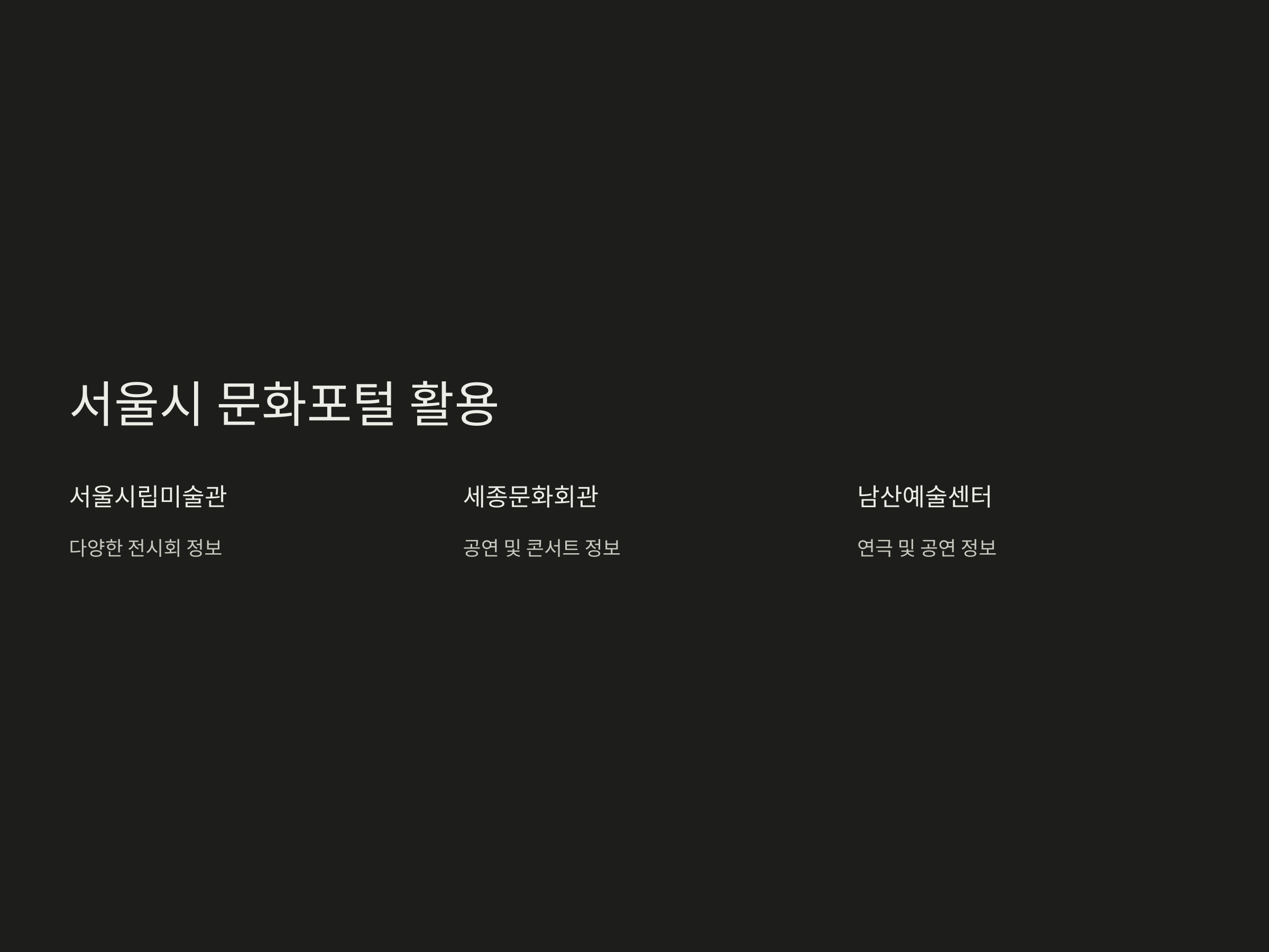 서울시 문화포털은 서울시에서 주최하는 다양한 무료 공연과 전시 정보를 한눈에 볼 수 있는 사이트입니다. 서울시립미술관, 세종문화회관, 남산예술센터 등에서 진행하는 무료 공연과 전시회 정보를 실시간으로 확인할 수 있습니다.