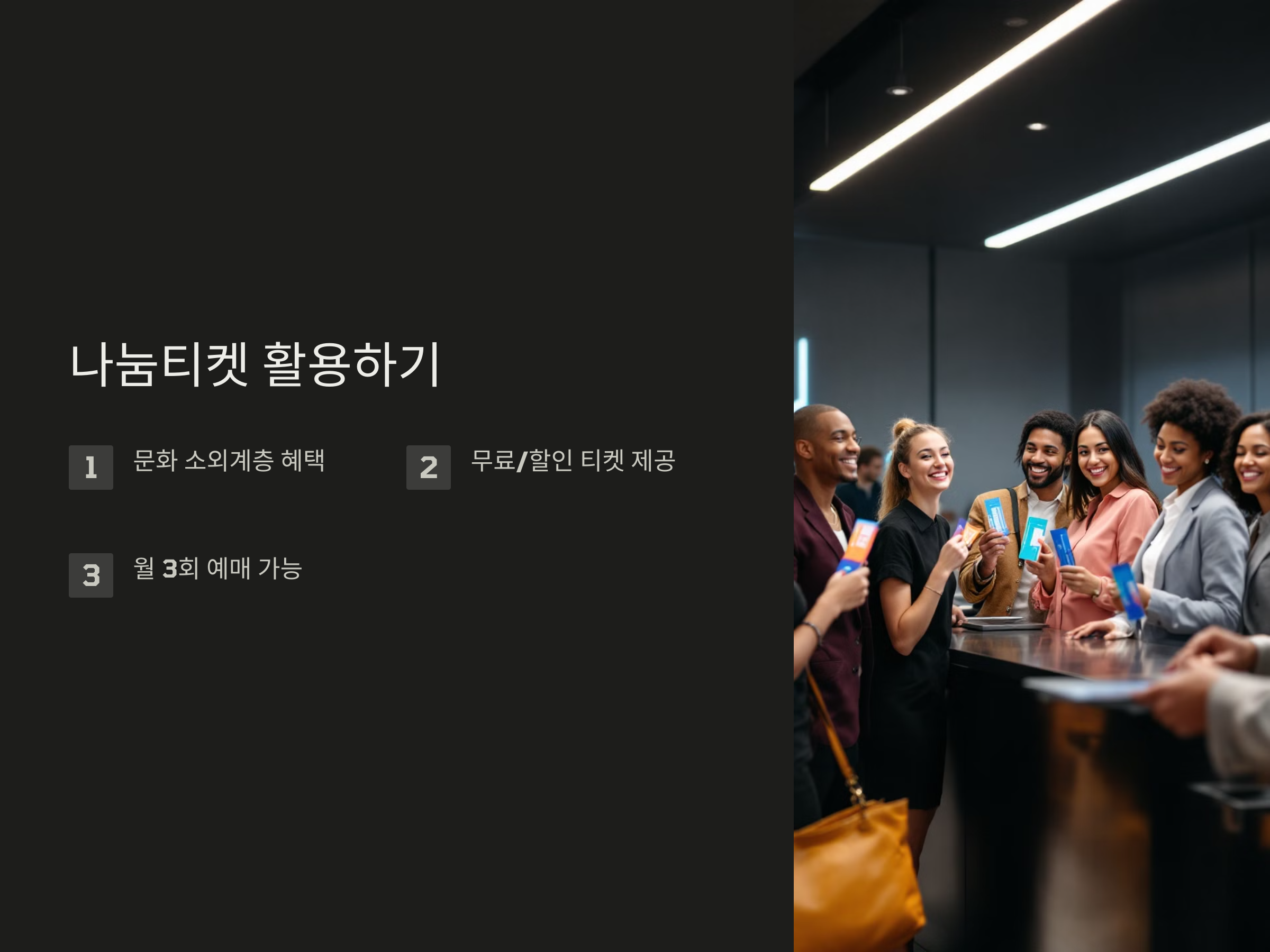 나눔티켓은 한국문화예술위원회에서 운영하는 프로그램으로, 문화누리카드 소지자, 기초생활수급자, 차상위 계층 등을 대상으로 공연이나 전시를 무료 또는 할인된 가격에 제공합니다. 회원 가입 후, 원하는 공연이나 전시를 선택하여 예매할 수 있으며, 무료 티켓은 월 3회까지 예매 가능합니다.
