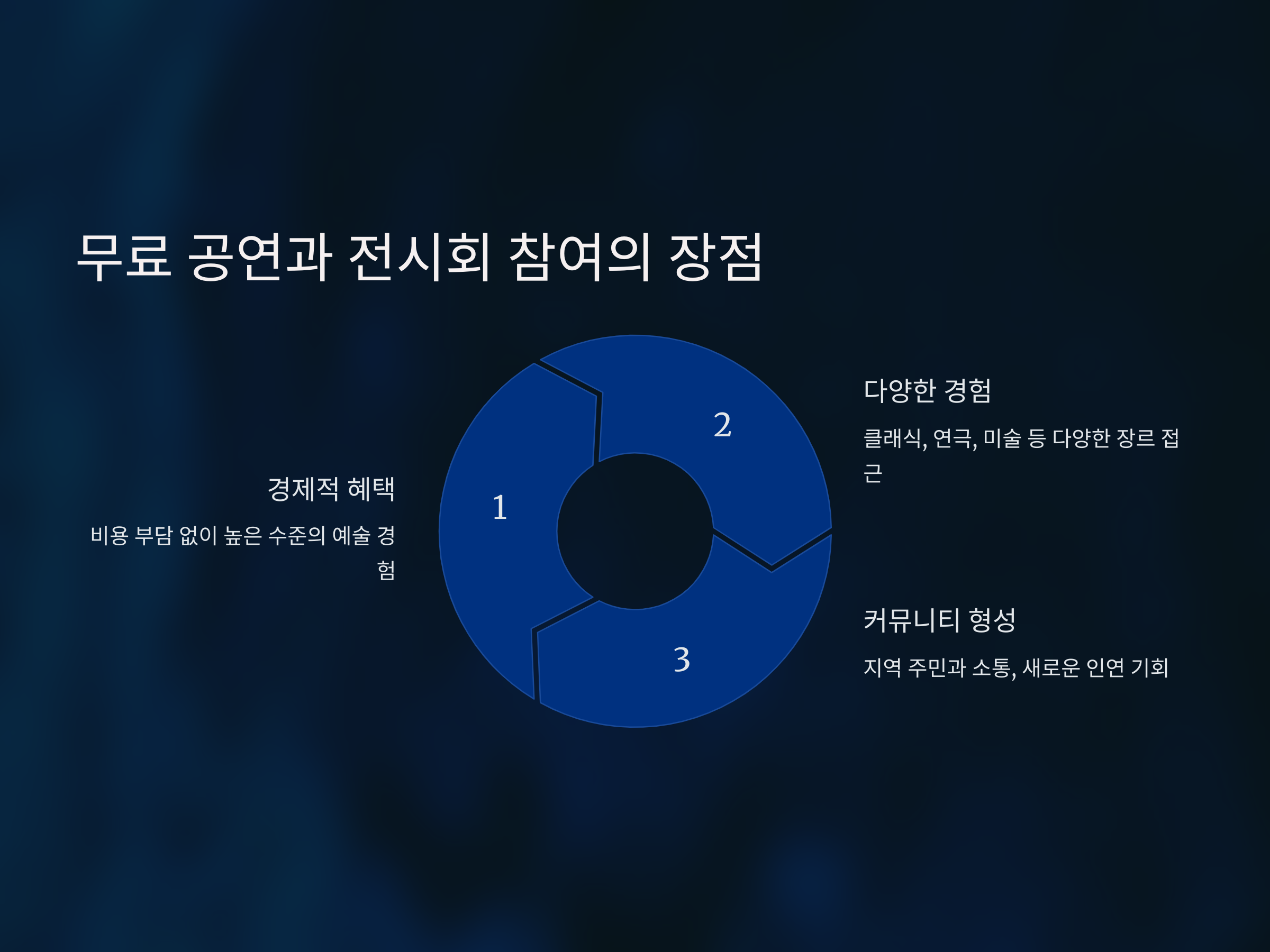 무료 공연과 전시회를 찾는 것뿐만 아니라, 실제로 참여할 때의 장점도 큽니다. 첫째, 경제적인 부담을 덜 수 있습니다. 가격이 비싼 티켓을 구입하지 않아도 높은 수준의 예술적 경험을 할 수 있기 때문에, 문화생활을 적극적으로 즐길 수 있습니다. 둘째, 다양한 예술 장르를 접할 수 있는 기회입니다. 클래식 음악, 연극, 현대 미술 등 다양한 장르의 작품을 경험할 수 있어 예술적인 시야를 넓힐 수 있습니다.