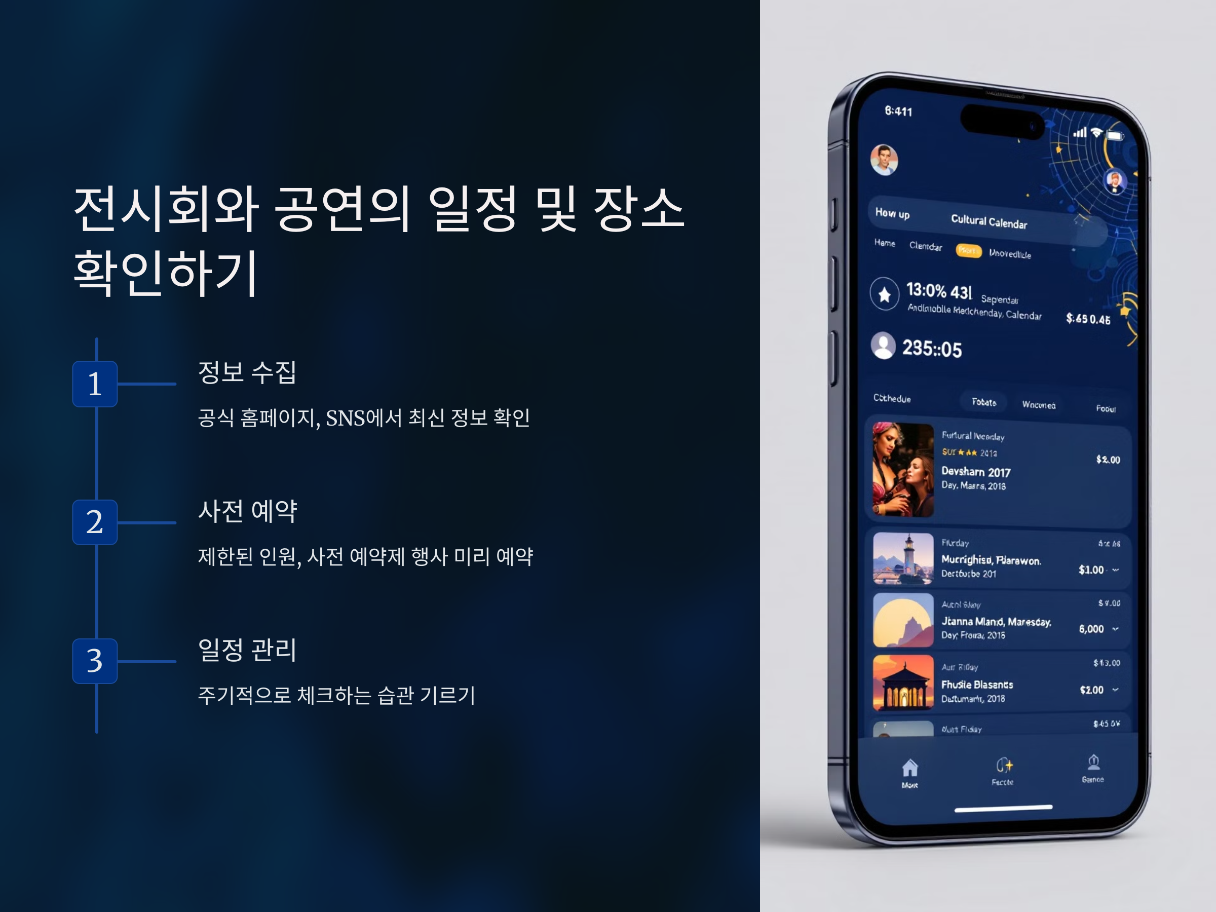 전시회나 공연의 예약 방법과 일정을 확인하려면 행사 주최 측의 공식 홈페이지나 전화 문의를 통해 정보를 확인할 수 있습니다. 또한, SNS나 온라인 커뮤니티에서 최신 정보를 확인할 수 있으니 주기적으로 체크하는 습관을 기르는 것이 좋습니다.