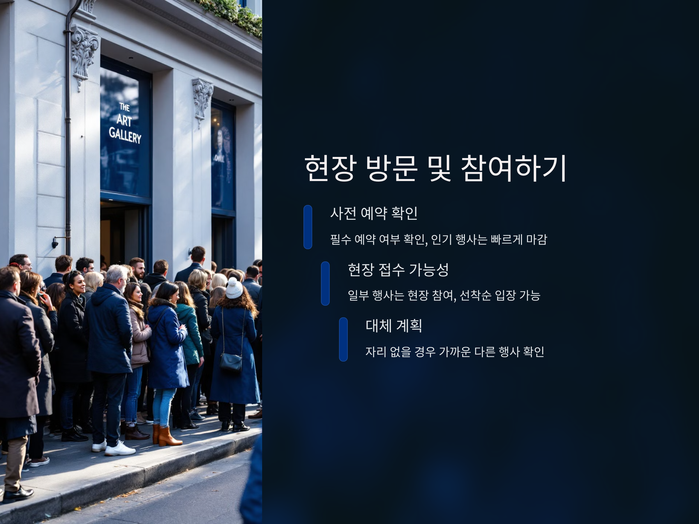 또한, 일부 행사에서는 현장에서도 즉석 참여가 가능하거나, 선착순으로 입장할 수 있는 경우도 있기 때문에 행사 당일 현장을 방문하는 것도 좋은 방법입니다. 현장에 도착했을 때 자리가 없거나 참여할 수 없다면, 가까운 다른 문화 행사 정보도 함께 확인하여 대체할 수 있도록 준비하는 것이 좋습니다.