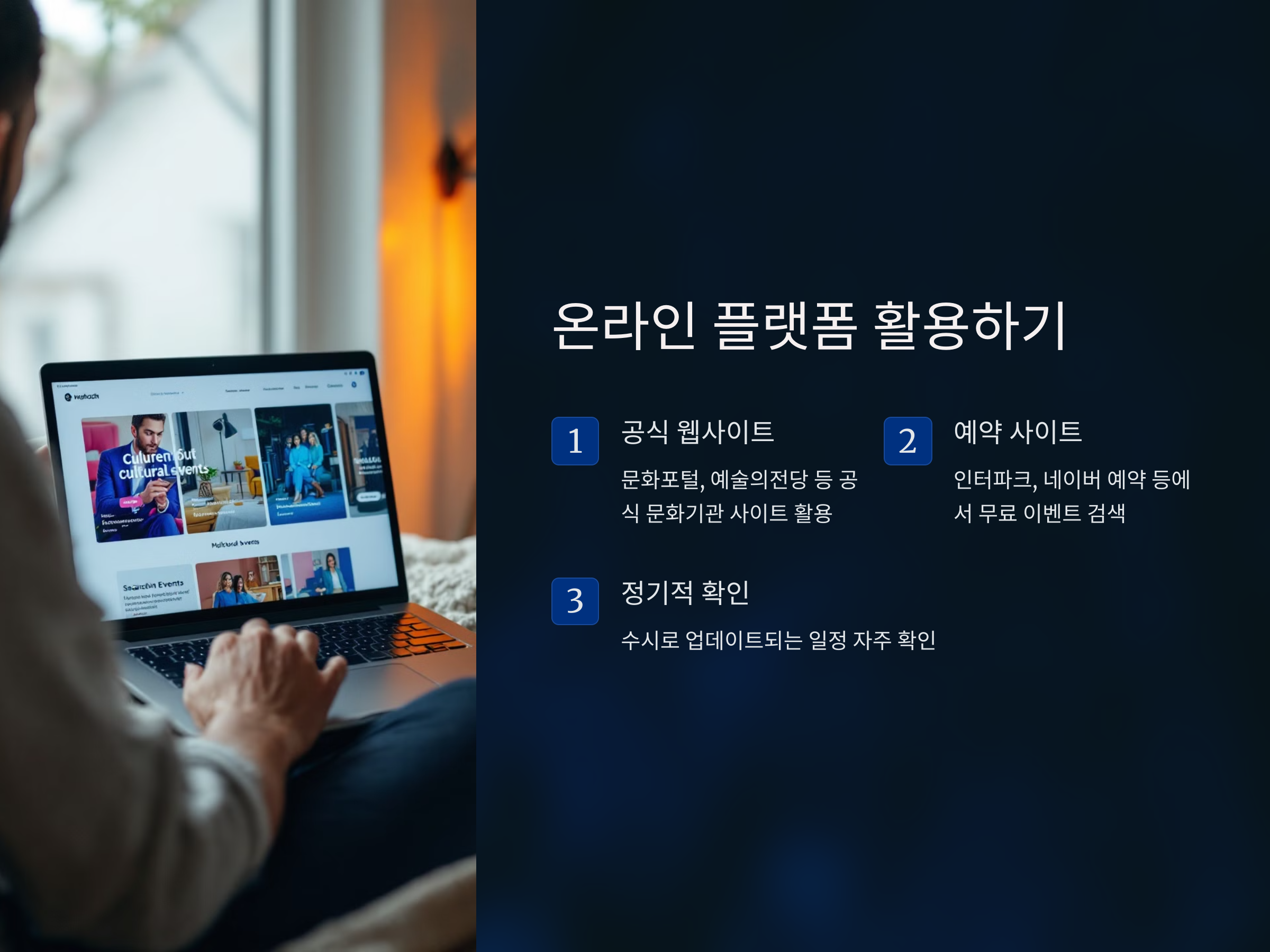 무료 공연과 전시회 정보를 찾는 가장 쉬운 방법 중 하나는 인터넷을 활용하는 것입니다. 최근에는 다양한 온라인 플랫폼에서 지역별, 장르별로 무료 문화 행사를 소개하고 있습니다. 예를 들어, 서울시와 같은 대도시의 공식 홈페이지나 문화예술 관련 웹사이트에서는 정기적으로 무료 공연 및 전시회를 안내합니다. 이러한 플랫폼에서는 미리 날짜를 확인하고 신청할 수 있어 매우 편리합니다.