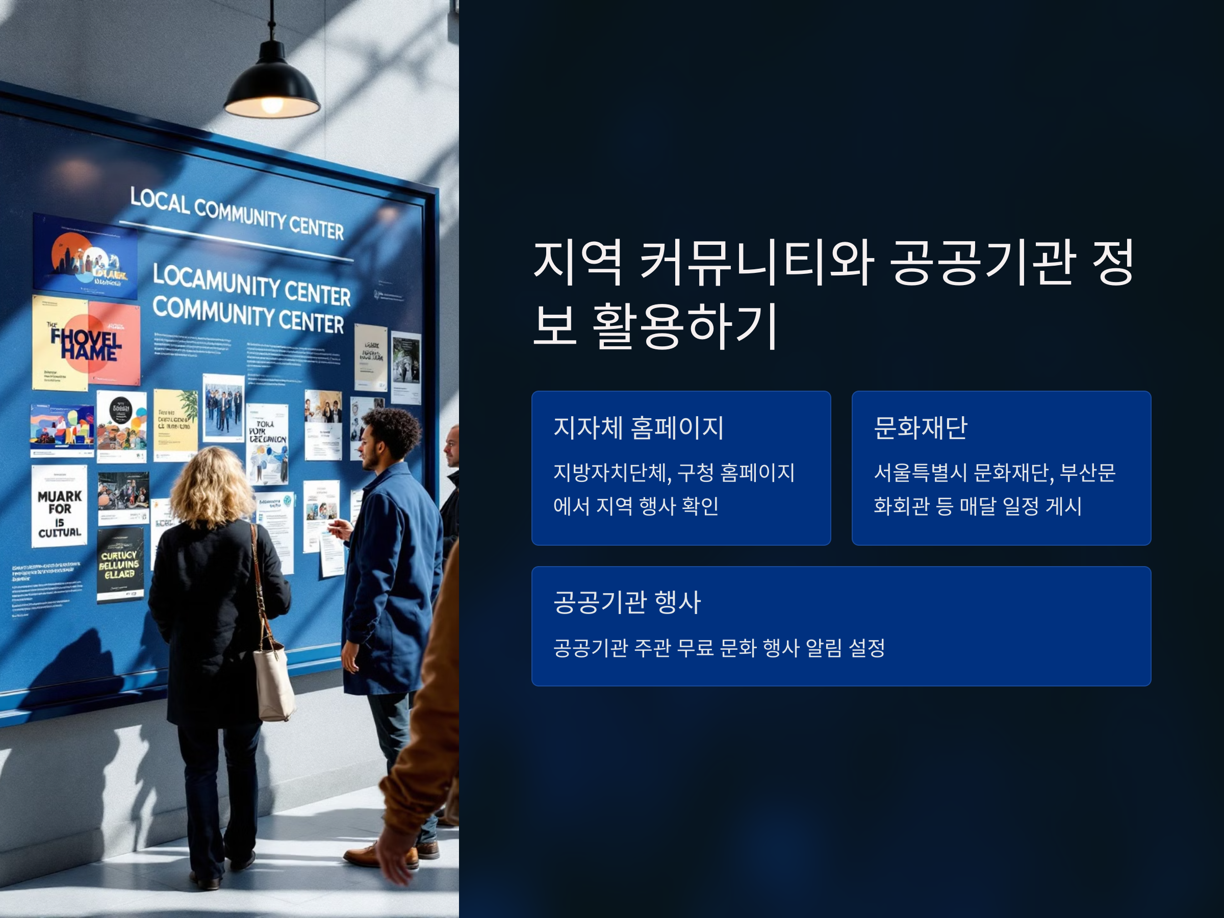 대부분의 무료 공연과 전시회는 지역 사회에서 진행됩니다. 지역 주민들을 대상으로 하는 무료 문화 행사 정보는 주로 지방자치단체의 공식 홈페이지나 지역 커뮤니티에서 찾을 수 있습니다. 서울시를 비롯한 대도시와 작은 마을에서도 지역 주민을 위한 무료 문화 행사를 많이 개최합니다.