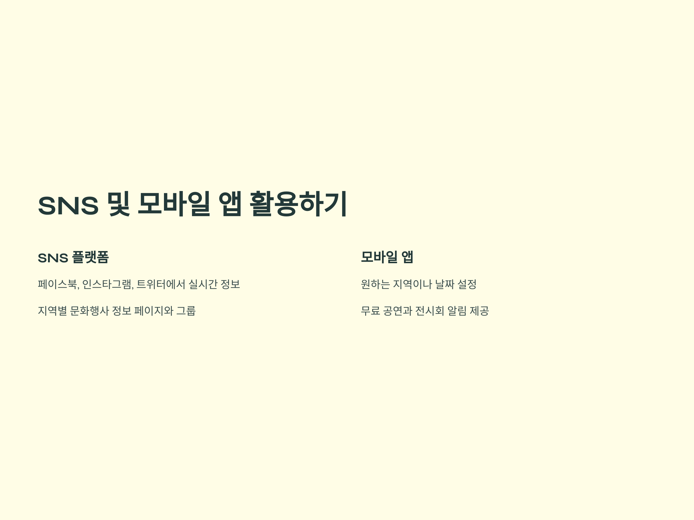 SNS 플랫폼은 실시간으로 다양한 정보가 공유되기 때문에, 무료 공연과 전시회 정보를 찾기에도 유용합니다. 페이스북, 인스타그램, 트위터 등의 SNS에서는 지역별 문화행사 정보를 실시간으로 업데이트하는 페이지나 그룹이 많습니다. 예를 들어, "서울 무료 공연" 또는 "부산 무료 전시회"와 같은 키워드를 검색하면 관련된 이벤트를 찾을 수 있습니다. 또한, 행사 주최 측에서 이벤트를 홍보하는 게시물도 많기 때문에 쉽게 정보를 얻을 수 있습니다.