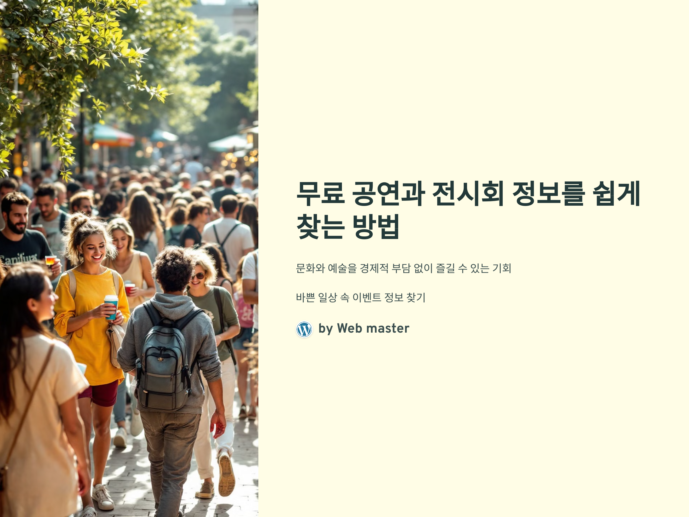 무료 공연과 전시회는 문화와 예술을 즐길 수 있는 좋은 기회를 제공합니다. 특히 많은 사람들이 경제적인 부담 없이 즐길 수 있다는 점에서 큰 인기를 끌고 있습니다. 하지만 바쁜 일상 속에서 이런 이벤트 정보를 빠르게 찾는 것은 쉽지 않죠. 그래서 이번 포스팅에서는 무료 공연과 전시회 정보를 쉽게 찾을 수 있는 방법을 소개하려고 합니다. 문화 행사 정보를 어떻게 효과적으로 찾을 수 있는지, 이 글에서 자세히 알아보겠습니다.