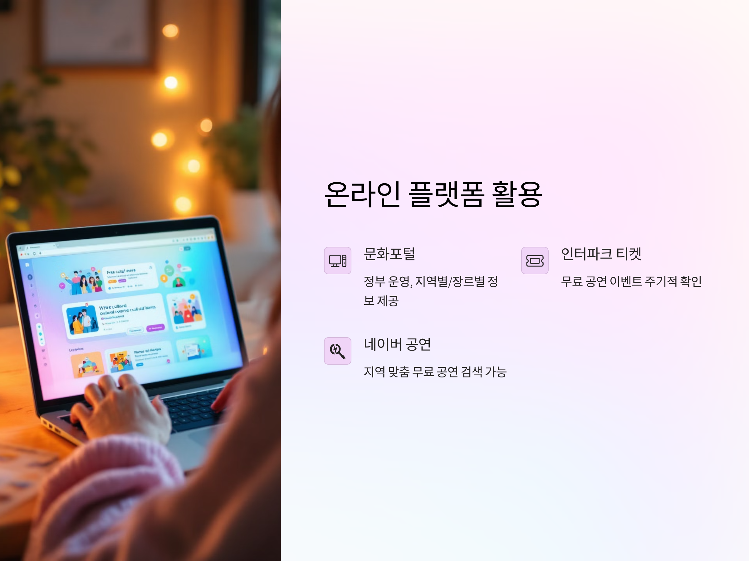 - 네이버 공연: 네이버에서는 공연 예매와 더불어 무료로 진행되는 다양한 공연 정보도 제공합니다. 지역에 맞춰 검색할 수 있어 편리합니다.