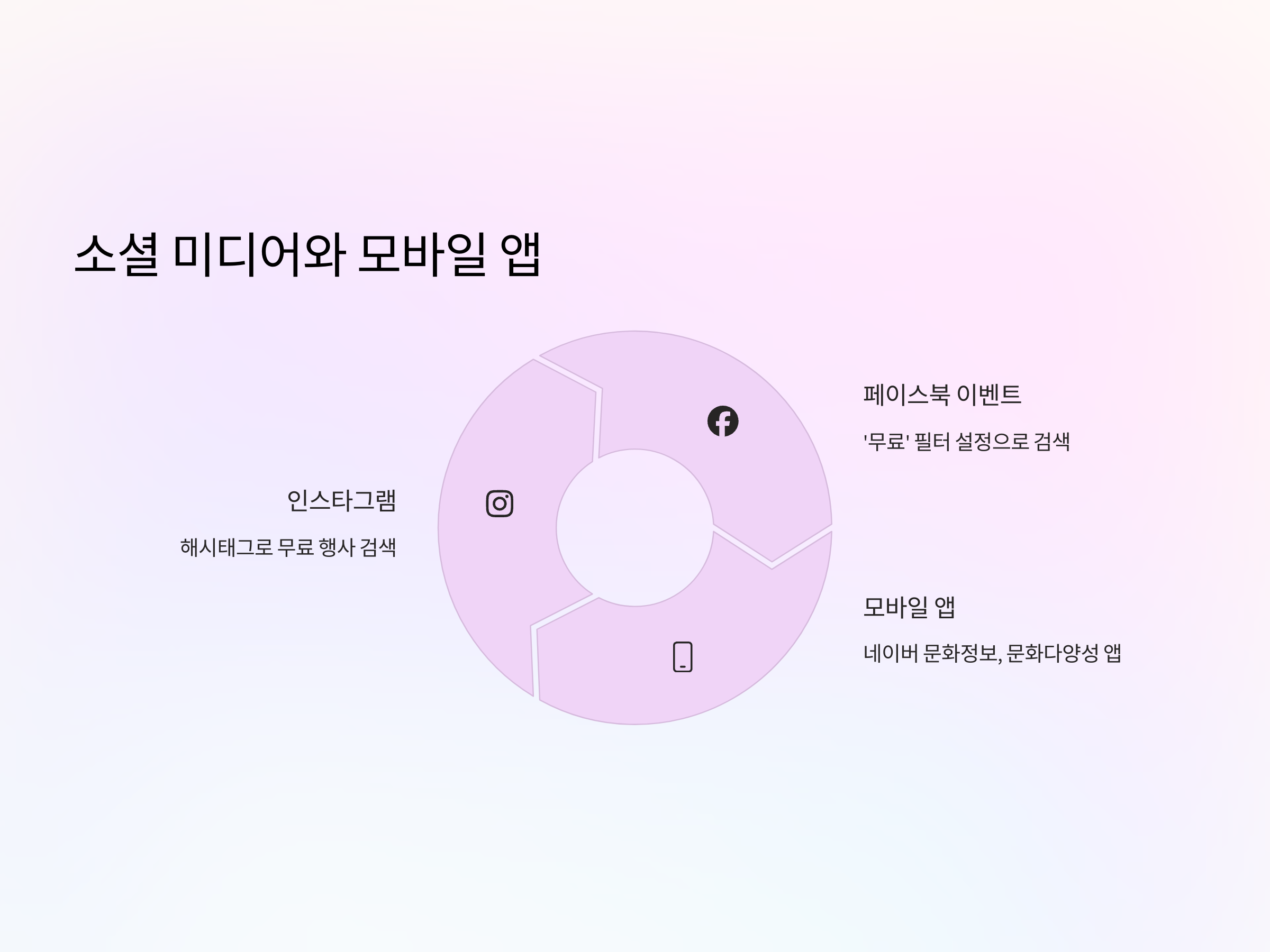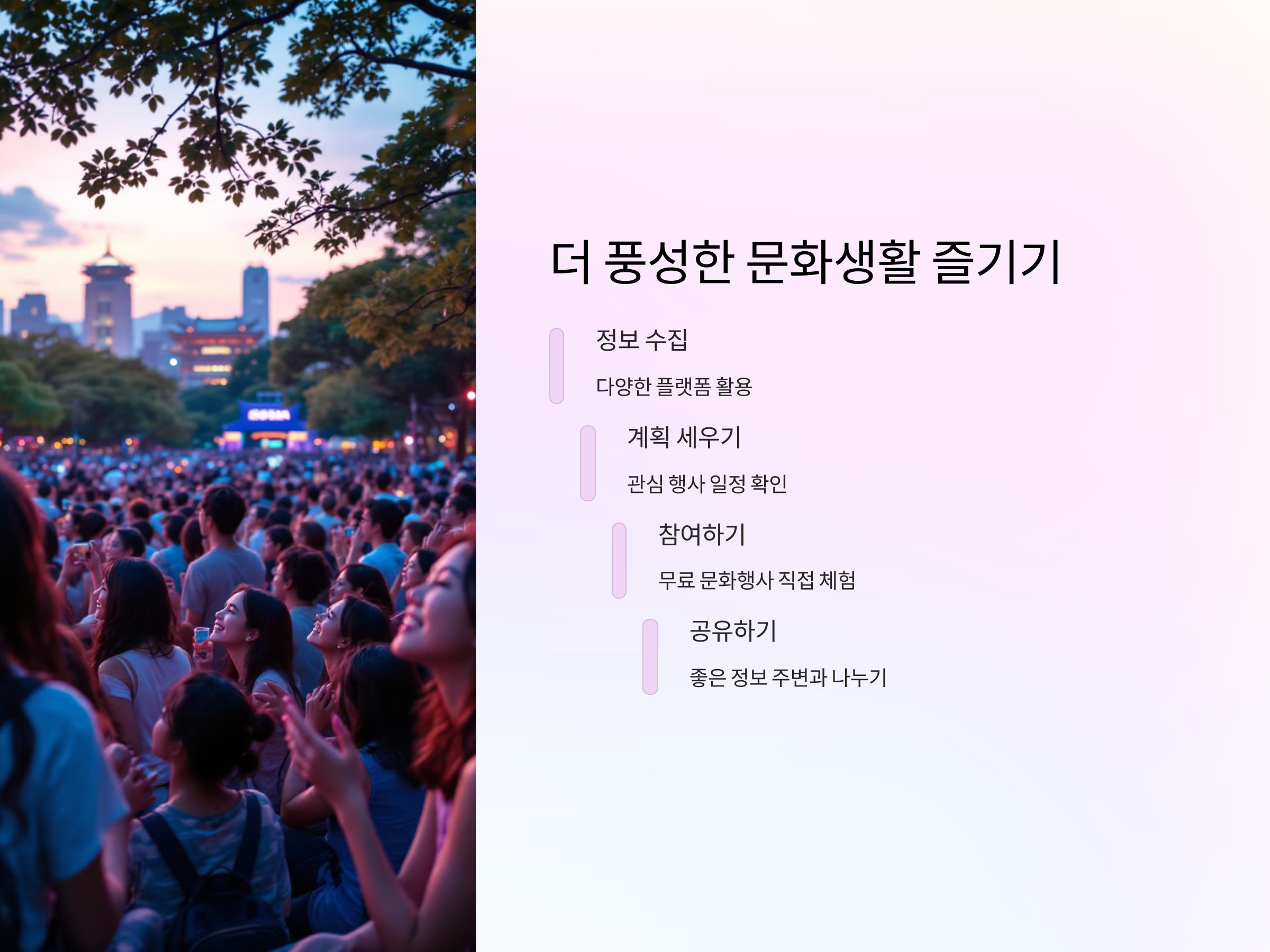 - 모바일 앱: ‘네이버 문화정보’, ‘문화다양성 앱’ 등 문화 행사를 안내하는 모바일 앱들이 있어, 언제 어디서든 무료 문화 행사 정보를 확인할 수 있습니다.