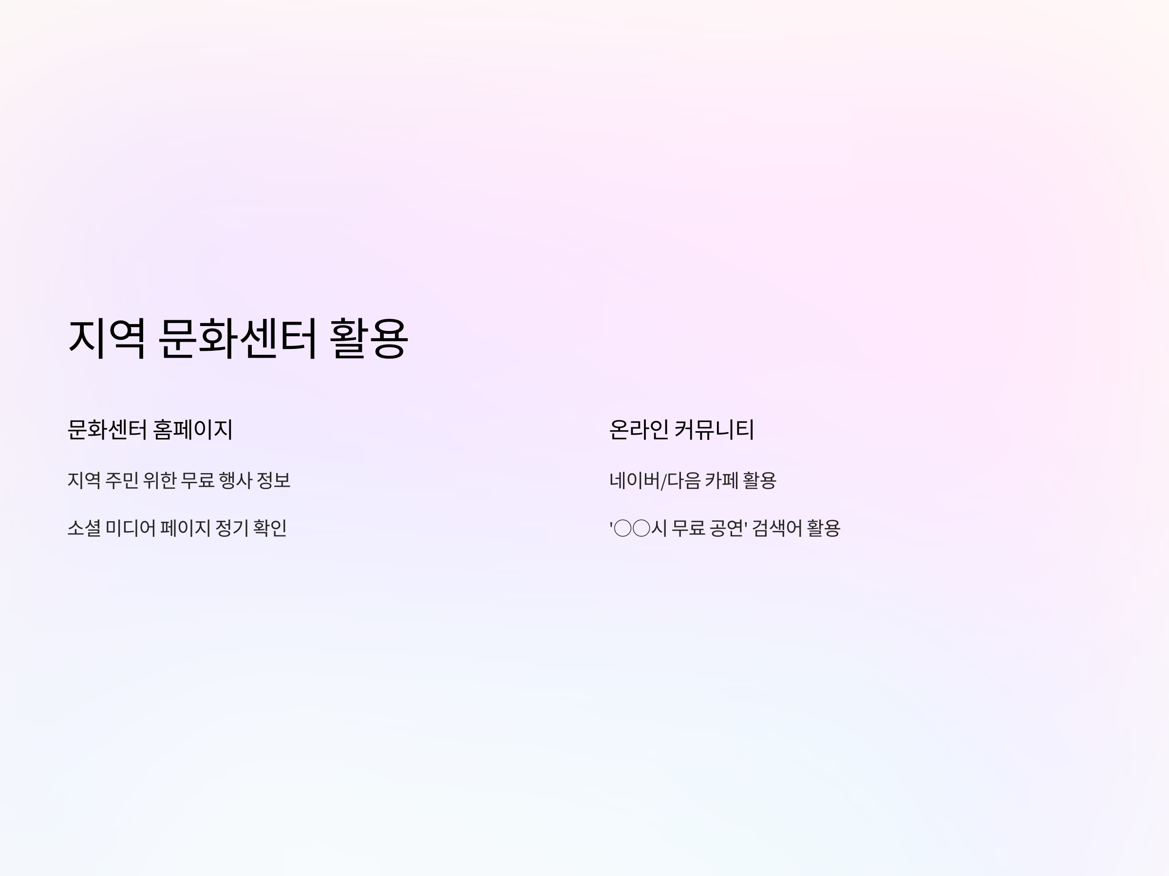 - 지역 문화센터 홈페이지: 각 지역마다 문화센터 홈페이지가 있으며, 이곳에서 지역 주민들을 위한 무료 문화 행사를 제공합니다. 홈페이지나 소셜 미디어 페이지를 자주 체크하면 좋습니다.