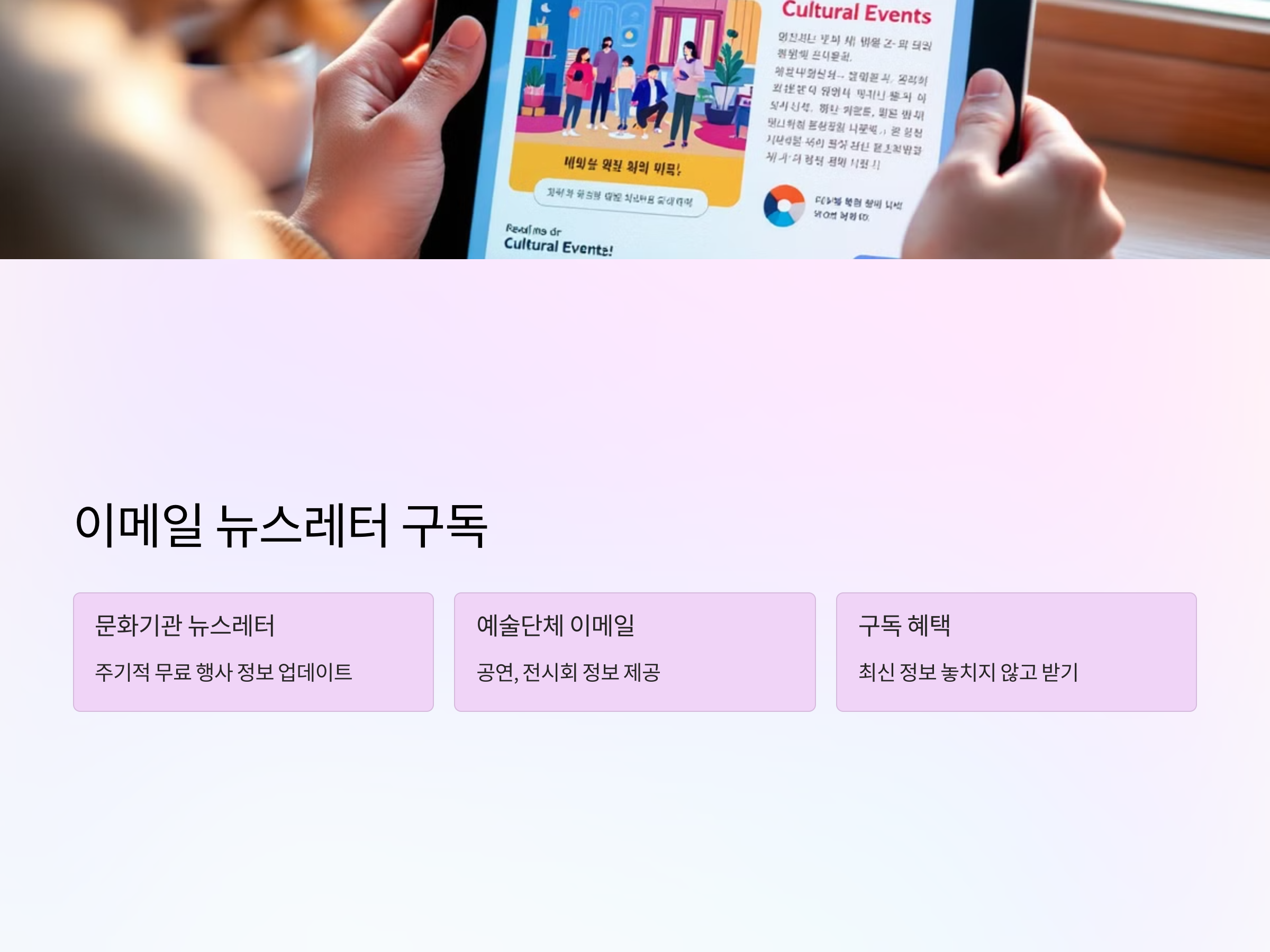 - 문화기관 뉴스레터: 문화예술기관들이 주기적으로 보내는 이메일 뉴스레터에 가입하면, 무료 행사 정보가 업데이트될 때마다 알림을 받을 수 있습니다.