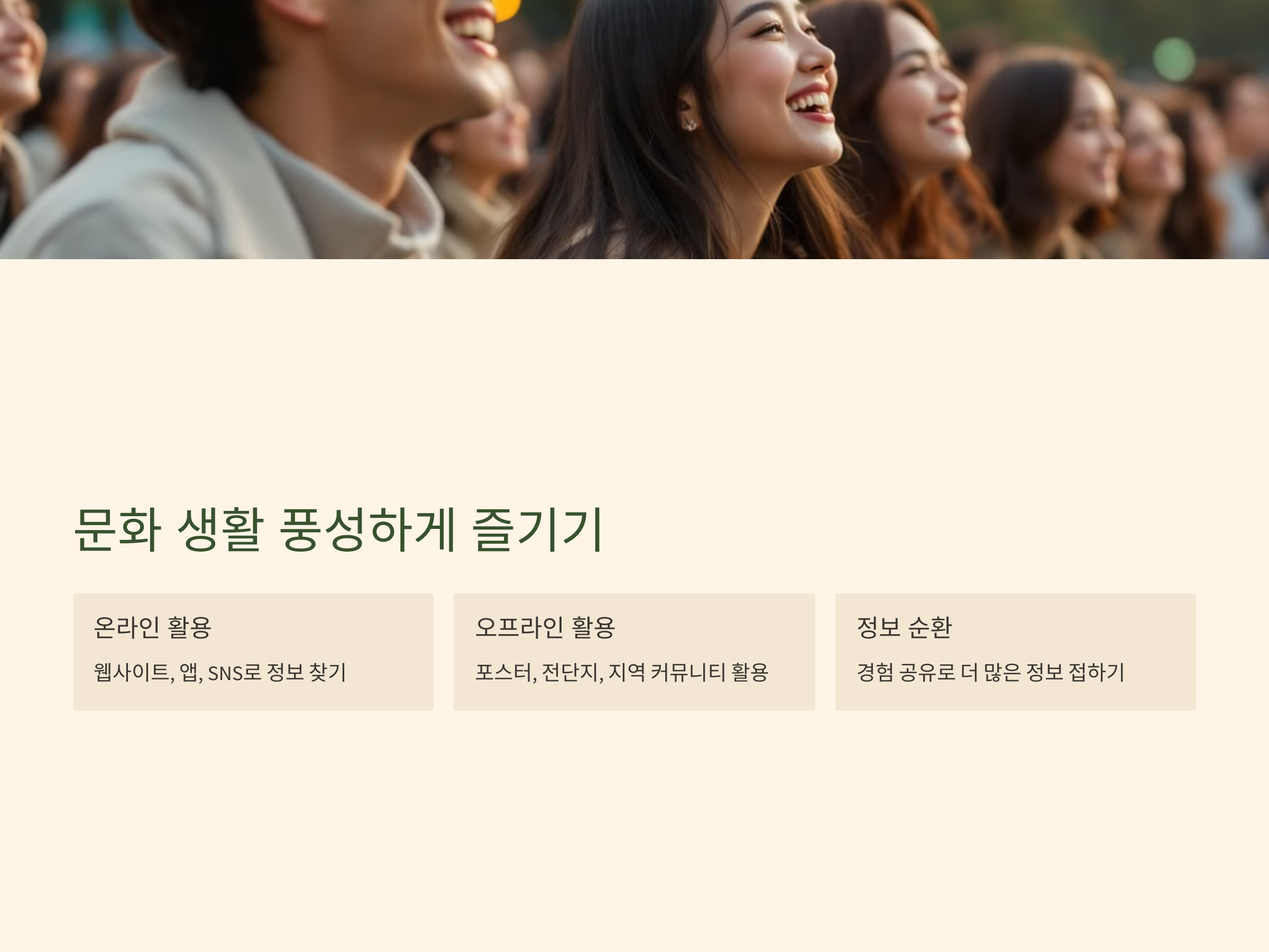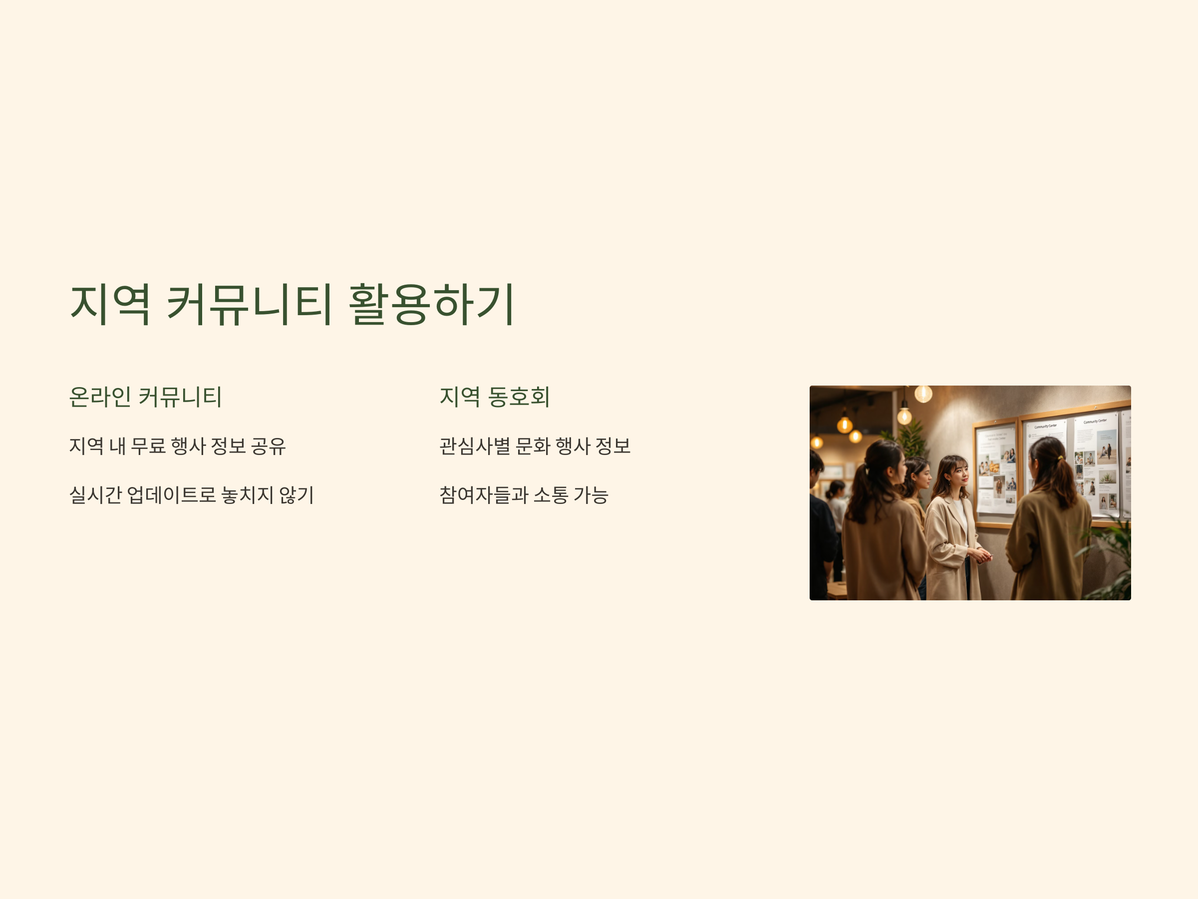 또 다른 좋은 방법은 지역 커뮤니티를 활용하는 것입니다. 대부분의 지역 커뮤니티나 동호회에서는 지역 내에서 열리는 무료 공연과 전시회에 대한 정보를 공유합니다. 특히 지역 주민들이 자주 이용하는 온라인 커뮤니티나 카페에서는 실시간으로 정보가 올라오는 경우가 많기 때문에 놓치지 않고 행사에 참여할 수 있습니다. 이렇게 지역 커뮤니티를 활용하면 단순히 행사 정보뿐만 아니라 참여자들과의 소통도 가능하다는 장점이 있습니다.