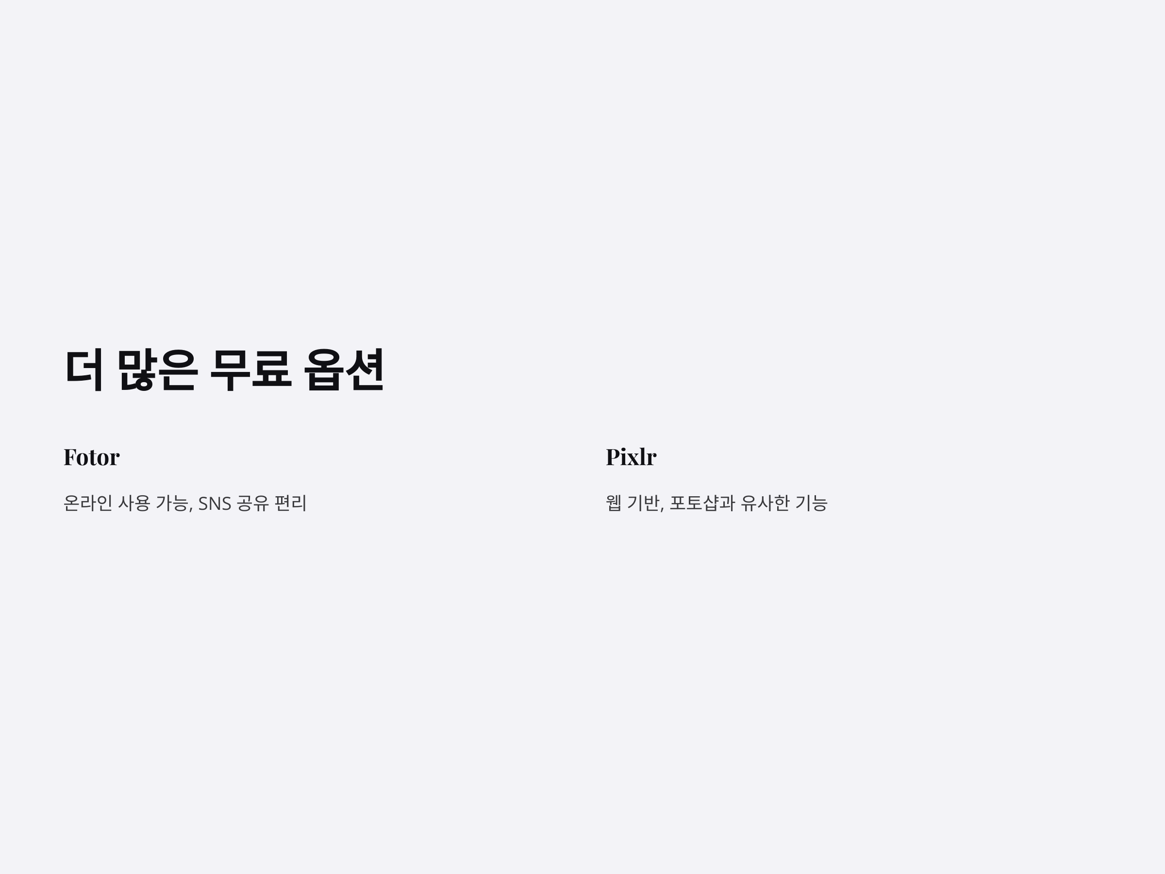 Fotor는 온라인에서도 사용할 수 있는 무료 사진 편집 도구입니다. 기본적인 사진 보정 기능 외에도 다양한 효과와 필터, 텍스트 추가 기능을 제공하여 초보자들이 쉽게 작업할 수 있습니다. 또한, 사진을 편집한 후 바로 SNS에 공유할 수 있어 매우 편리합니다.