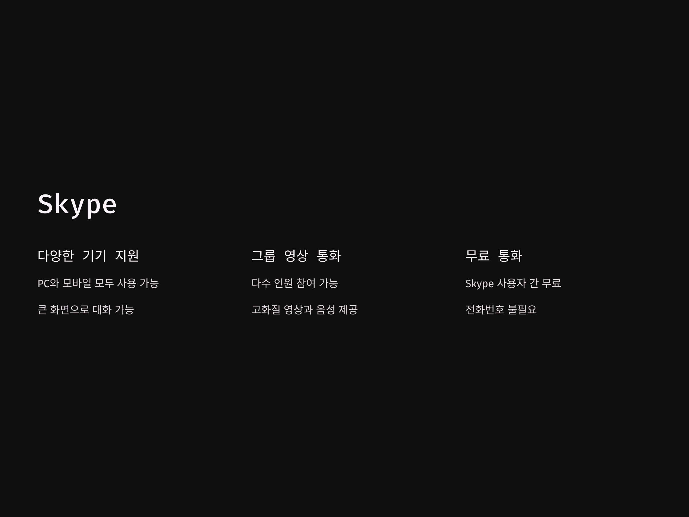 Skype는 오래된 영상 통화 앱이지만 여전히 많은 사람들이 이용하고 있습니다. Skype의 특징은 무엇보다도 PC와 모바일을 모두 지원한다는 점입니다. 특히 PC에서 큰 화면으로 가족과의 대화를 나누고 싶은 경우 유용하게 활용할 수 있습니다. Skype는 1:1뿐만 아니라 다수의 인원이 참여하는 그룹 영상 통화도 지원하며, 고화질 영상과 음성을 제공하여 품질 좋은 통화가 가능합니다. Skype는 전화번호를 사용하는 것과는 달리 Skype 사용자 간에 무료로 통화할 수 있는 점도 큰 장점입니다.