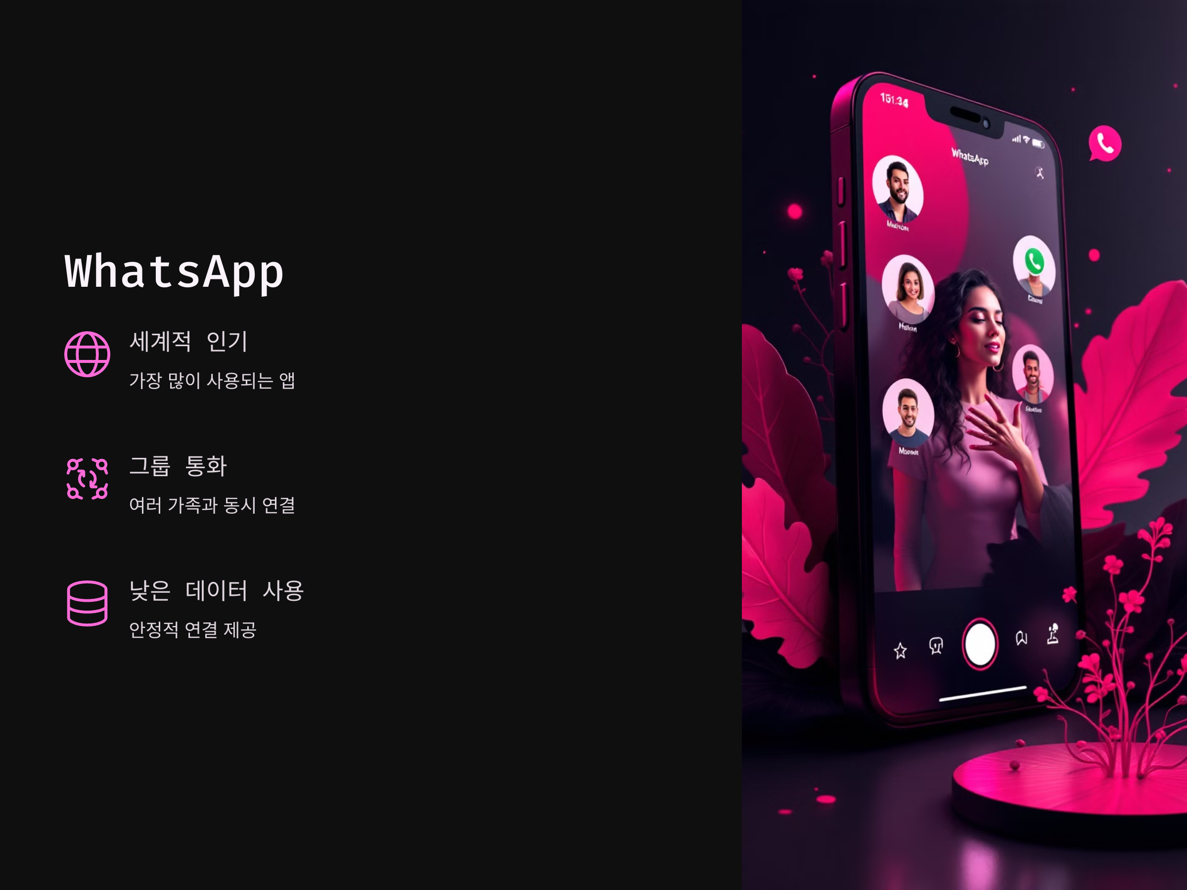 WhatsApp은 세계적으로 가장 많이 사용되는 무료 영상 통화 앱 중 하나입니다. 텍스트 메시지, 음성 메시지, 파일 전송, 그리고 영상 통화까지 다양한 기능을 제공합니다. 특히, 사용이 간편하고, 그룹 영상 통화도 지원해 여러 명의 가족과 동시에 연락할 수 있다는 점에서 큰 인기를 끌고 있습니다. WhatsApp은 안정적인 연결과 낮은 데이터 사용량으로도 좋은 평가를 받고 있으며, iOS와 Android 모두 지원합니다. 또한, 사용자가 많아서 가족뿐만 아니라 친구들과도 쉽게 소통할 수 있습니다.