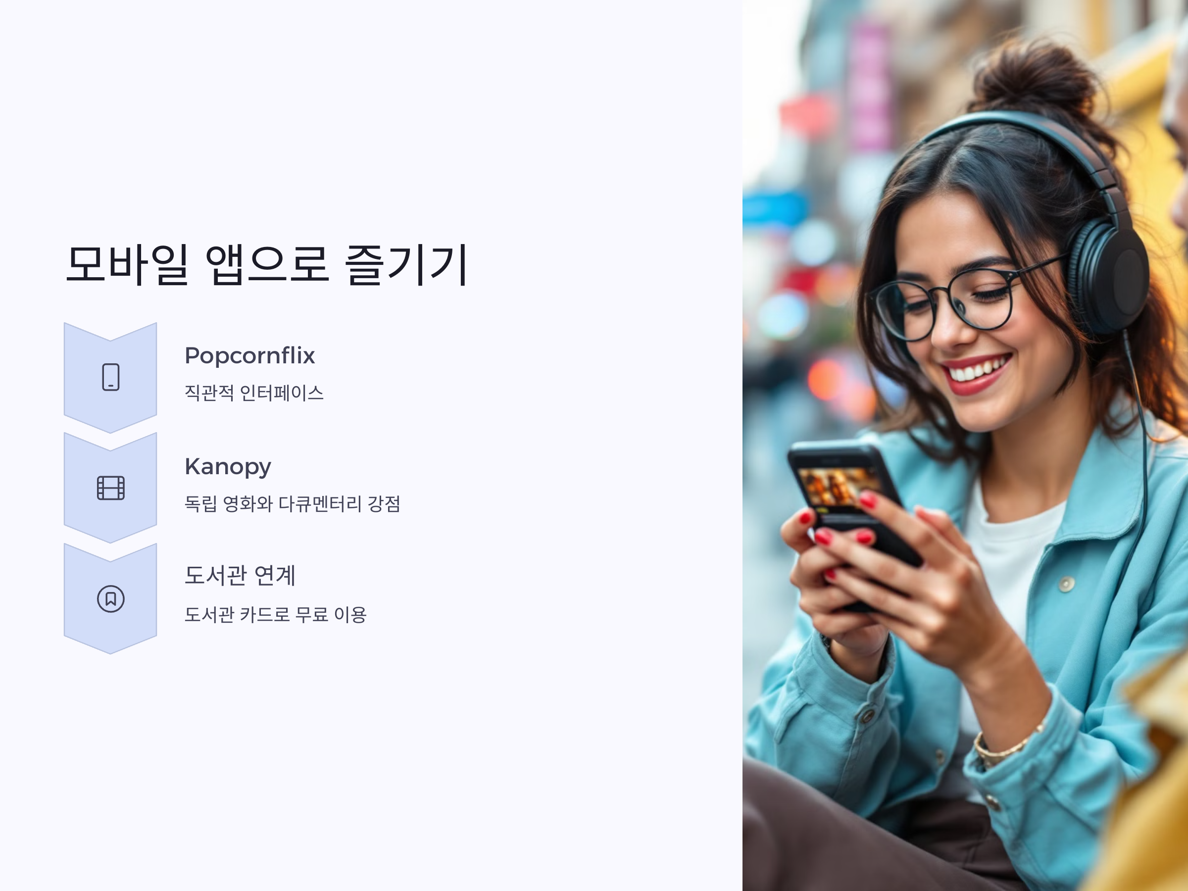 Popcornflix 외에도 "Kanopy"라는 앱이 있는데, Kanopy는 특히 독립 영화와 다큐멘터리 영화에 강점이 있습니다. 도서관 카드나 대학 계정이 있다면 Kanopy를 무료로 이용할 수 있습니다. 이 앱은 교육적이고 깊이 있는 영화를 제공하는 특징이 있습니다.
