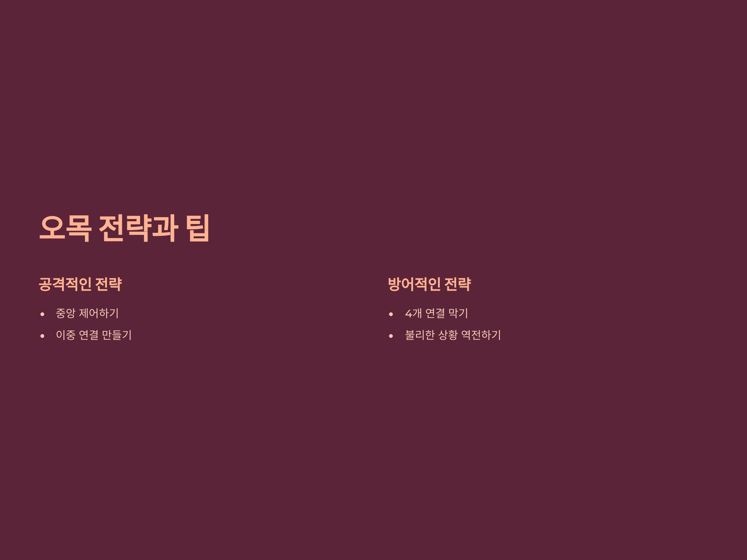 - 이중 연결: 두 개의 4개 연속된 돌을 놓으면 상대방은 이를 막을 수 없습니다. 이 방법을 활용하면 상대방의 방어를 뚫고 쉽게 5개의 돌을 연속으로 놓을 수 있습니다.