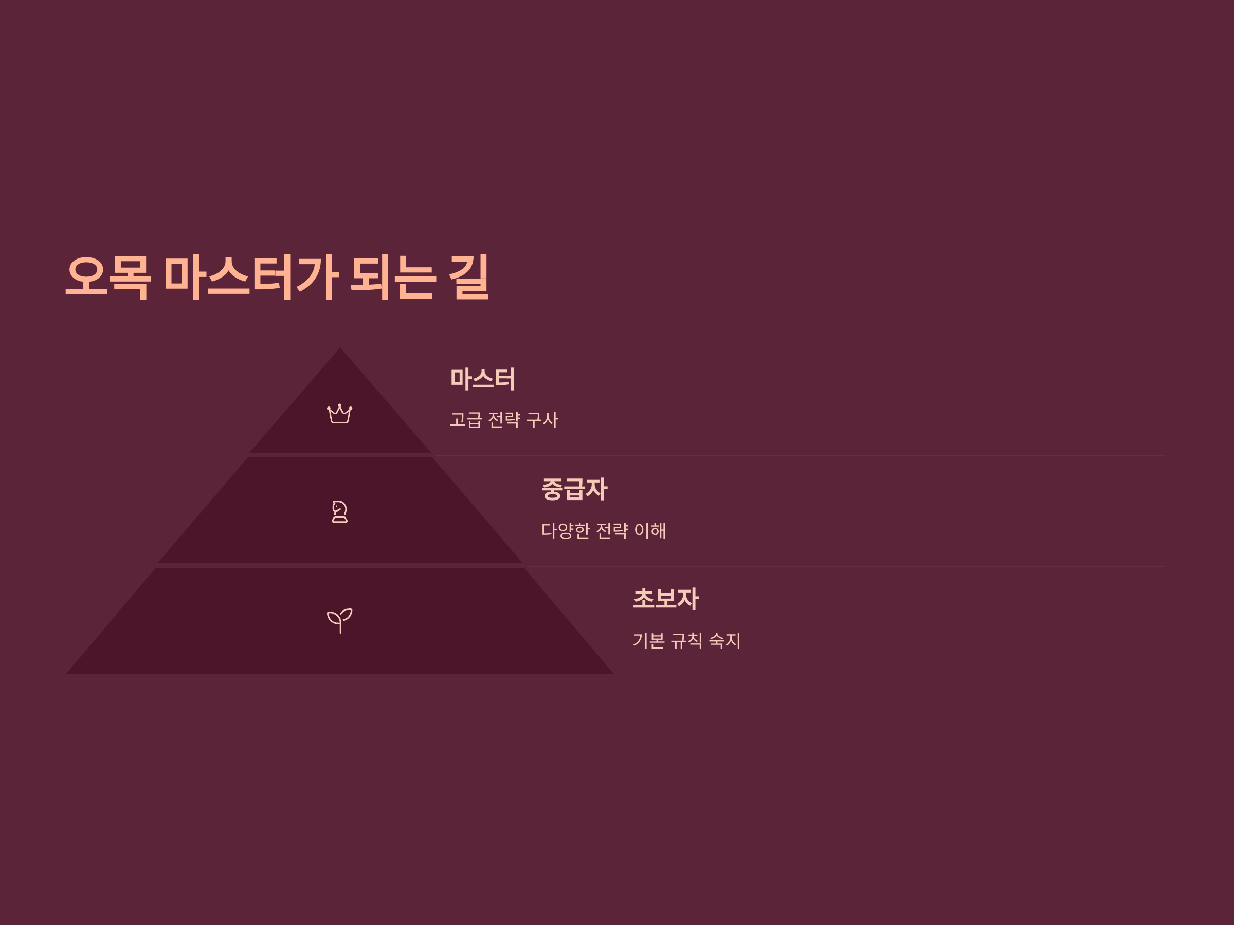 - 중앙 제어: 게임을 시작할 때 중앙에 돌을 놓는 것이 유리합니다. 중앙을 차지하면 모든 방향으로 쉽게 확장을 할 수 있기 때문입니다.