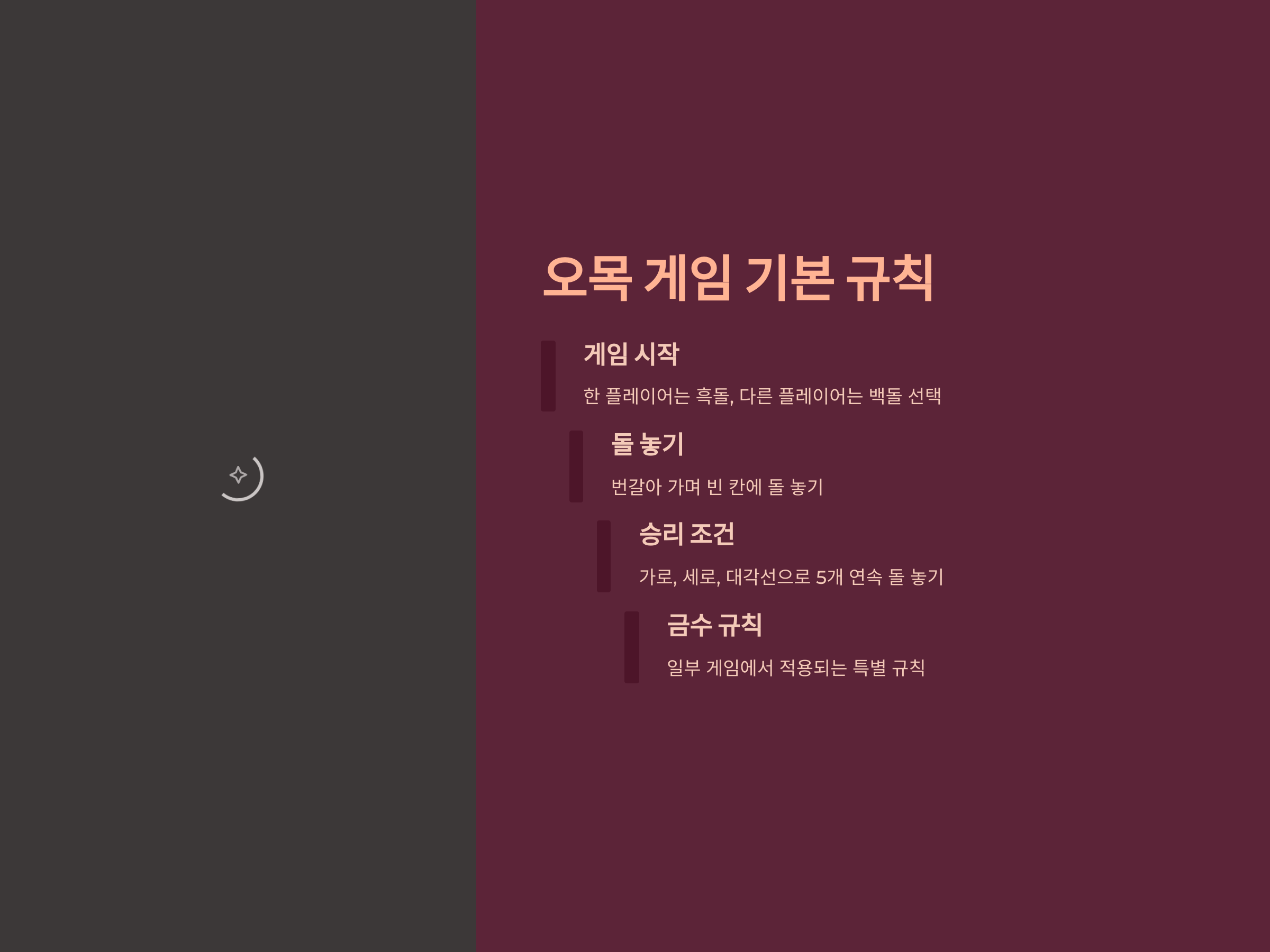 - 연속 5개 돌: 가로, 세로 또는 대각선으로 연속된 5개의 돌을 먼저 놓은 플레이어가 승리합니다.